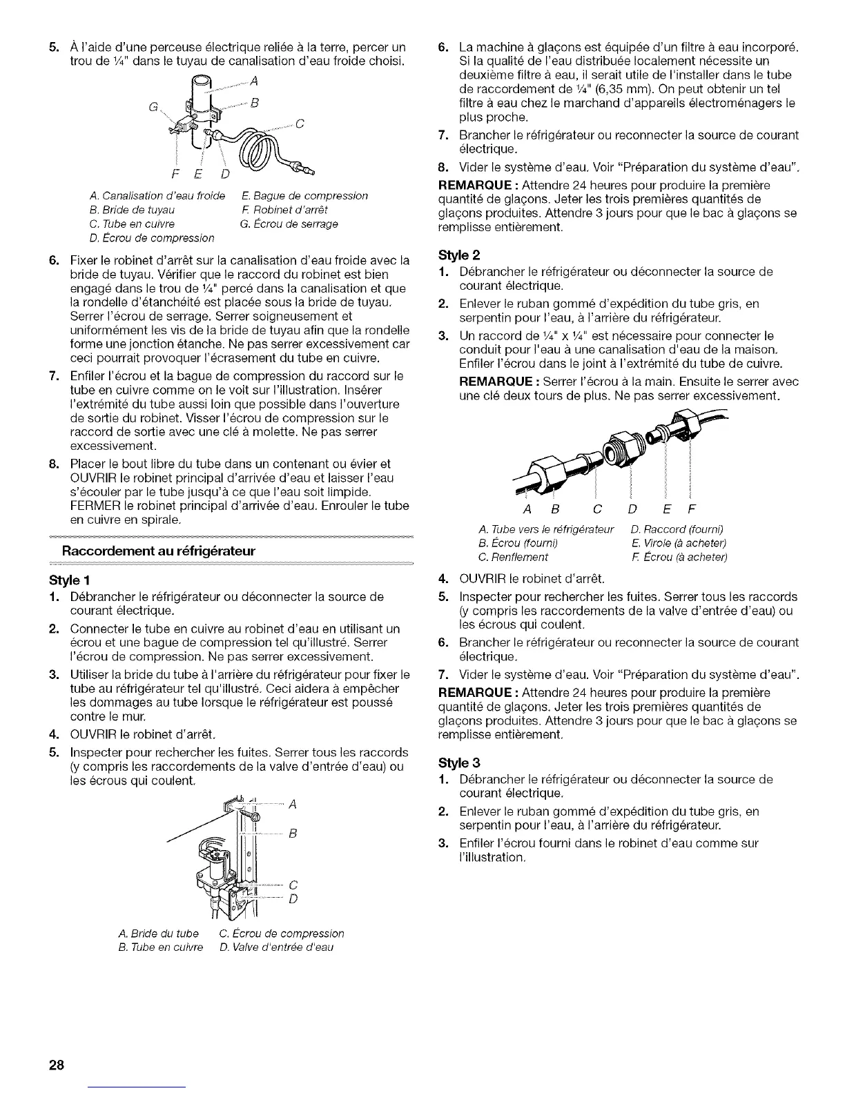 A. Tube vers le r_frig_rateur D. Raccord (fourni)