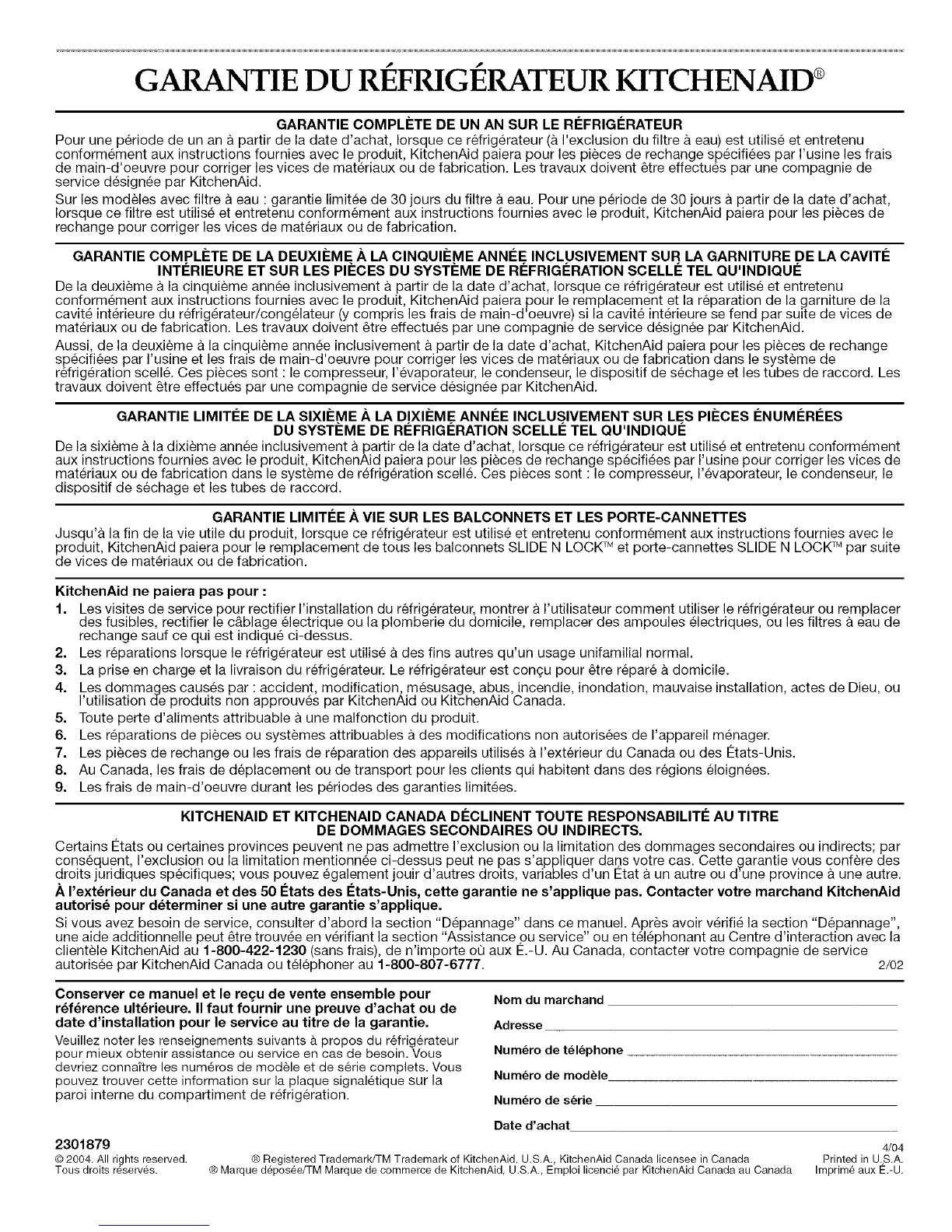autorisee par KitchenAid Canada ou telephoner au 1-800-807-8777. 2/02