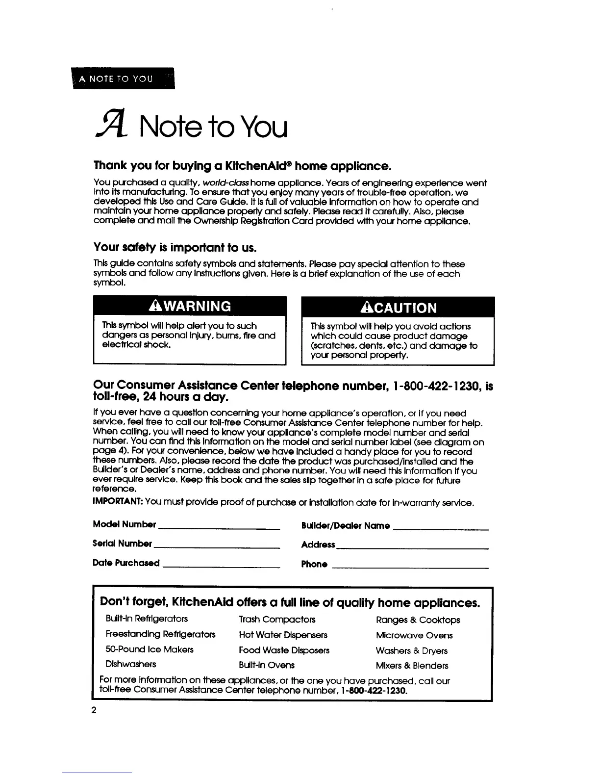 KitchenAid KTRC18K - A Note to You; Safety Symbols Explained; Consumer Assistance and Information