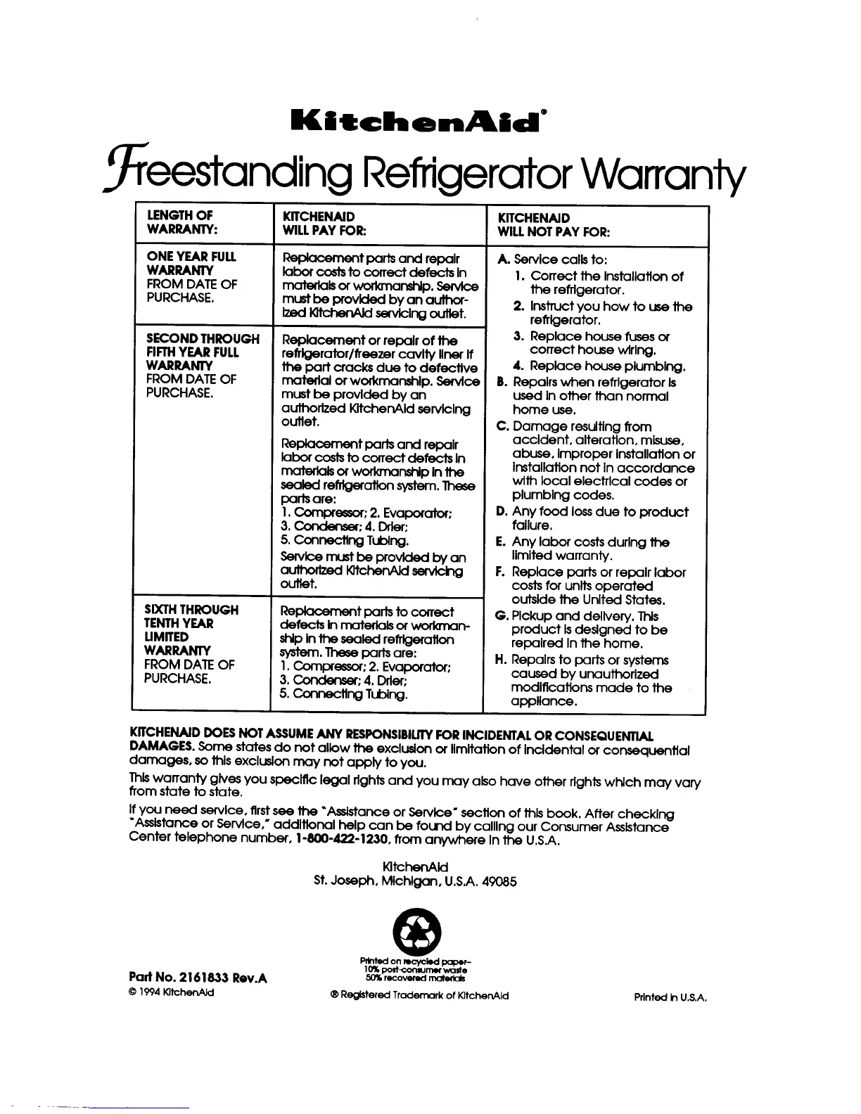 KitchenAid KTRC18K - Freestanding Refrigerator Warranty; Warranty Coverage Details; What KitchenAid Will Pay For; What KitchenAid Will Not Pay For
