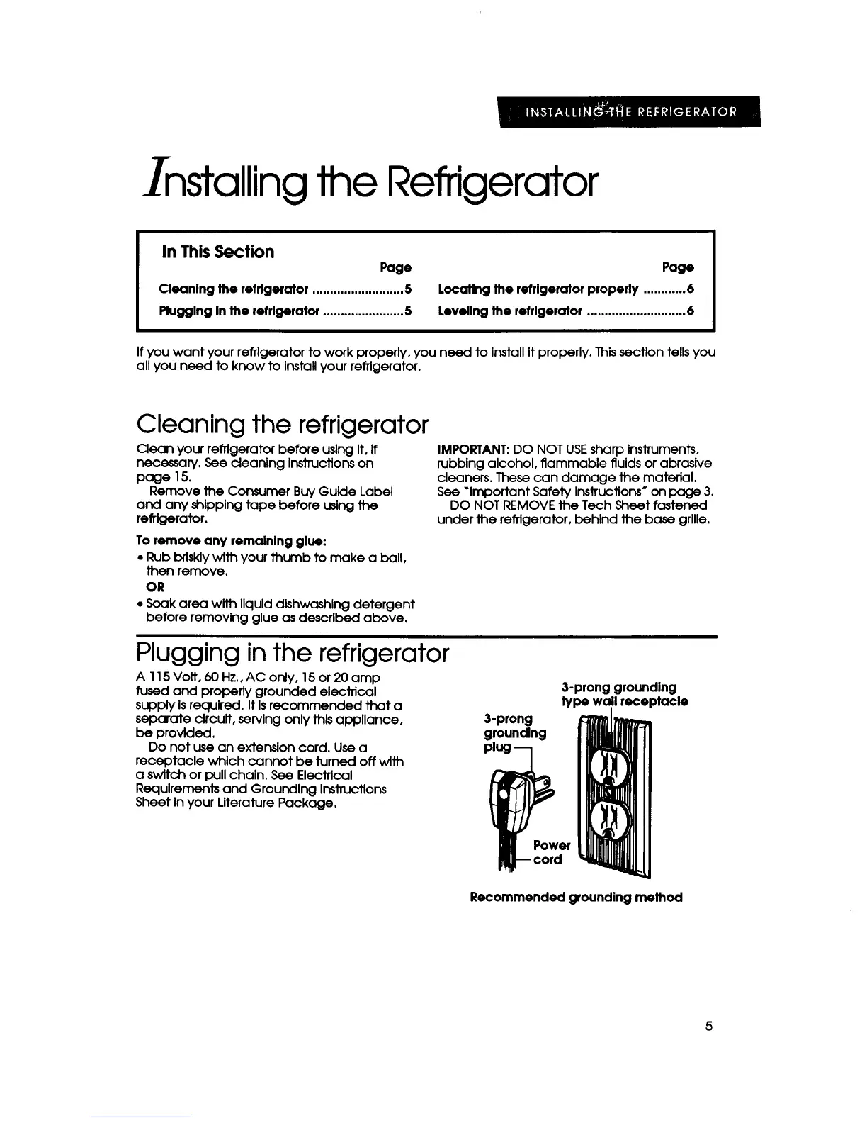 KitchenAid KTRC18K - Installing the Refrigerator; Cleaning and Preparation for Use; Electrical Supply Requirements