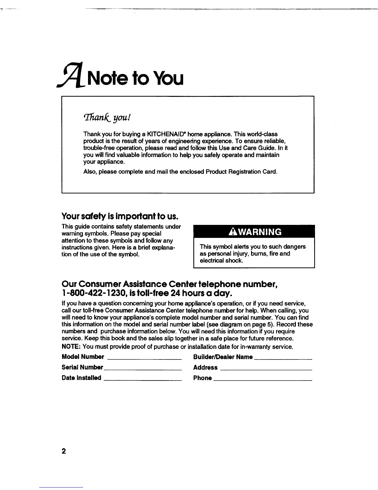 KitchenAid KUCC151 - A Note to You; Customer Assistance and Contact