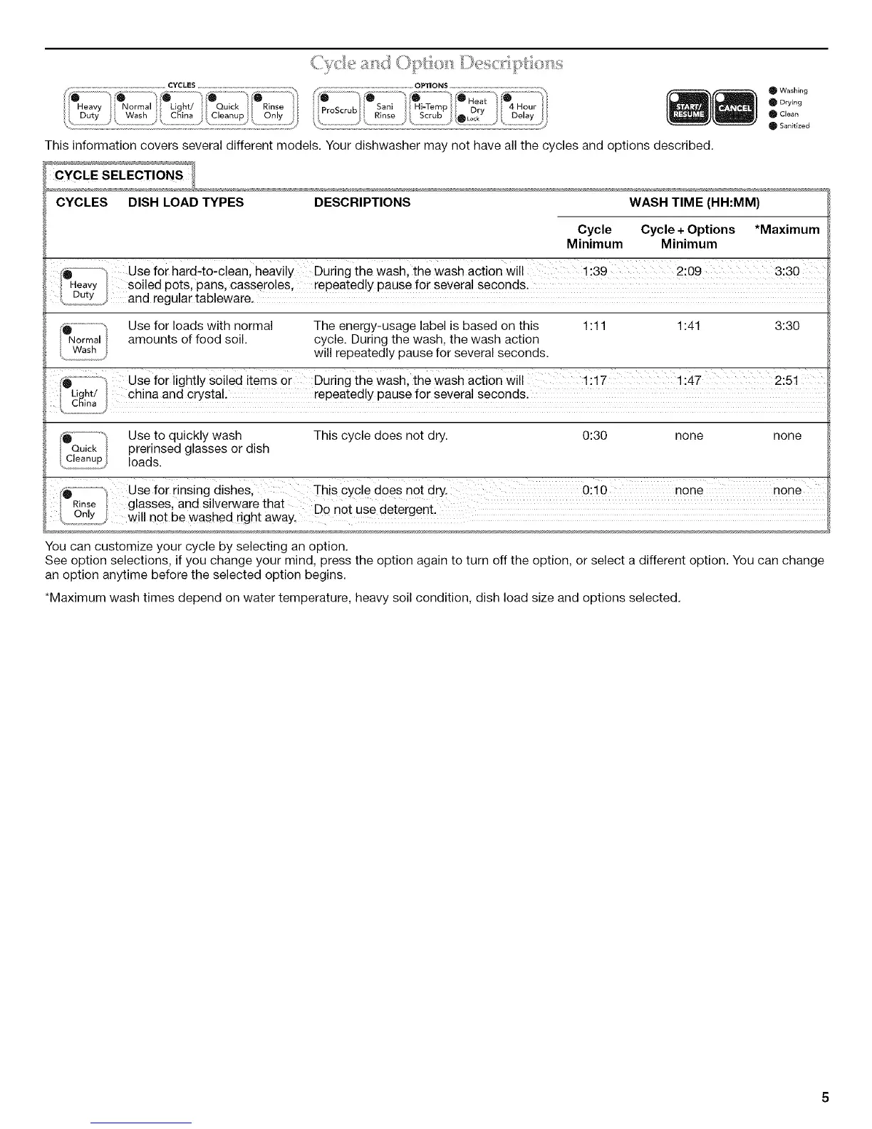 This information covers several different models. Your dishwasher may not have all the cycles and options described.
