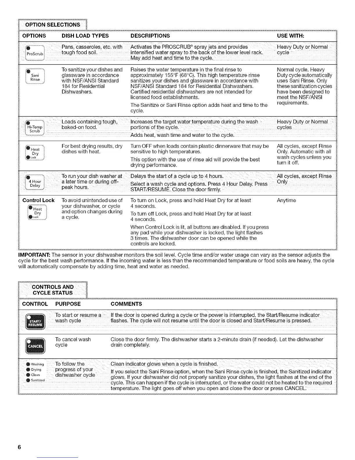 IMPORTANT: The sensor in your dishwasher monitors the soil level. Cycle time and/or water usage can vary as the sensor adjusts the