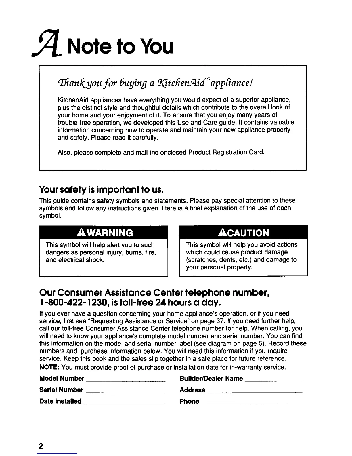 KitchenAid KUDA23SB - A Note to You; Your Safety is Important