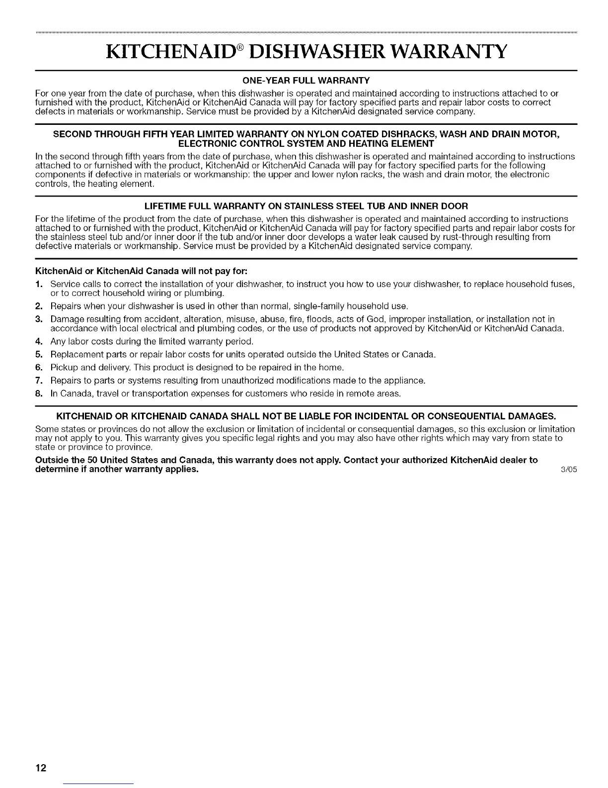 KITCHENAID OR KITCHENAID CANADA SHALL NOT BE LIABLE FOR INCIDENTAL OR CONSEQUENTIAL DAMAGES.