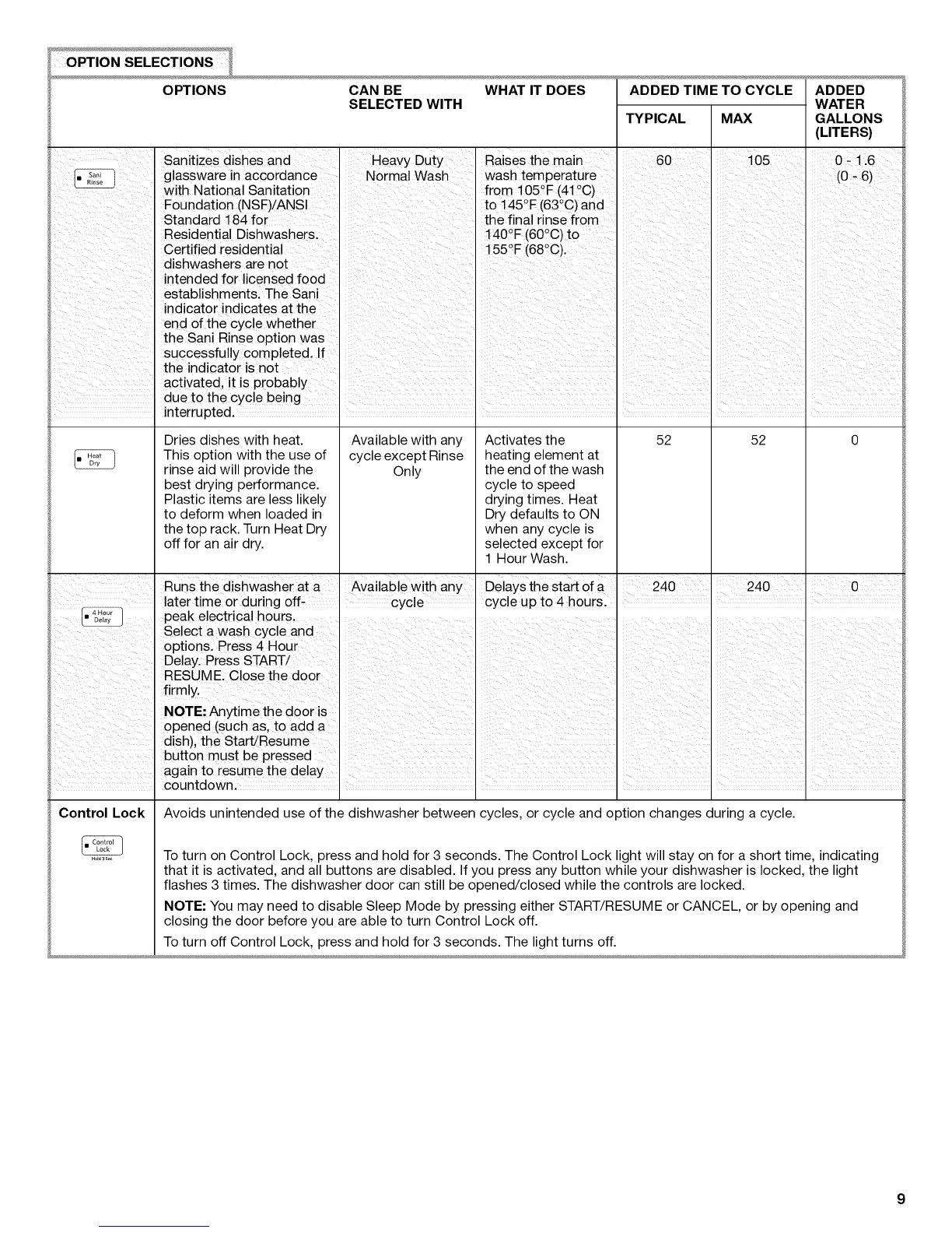 Control Lock Avoids unintended use of the dishwasher between cycles, or cycle and option changes during a cycle.