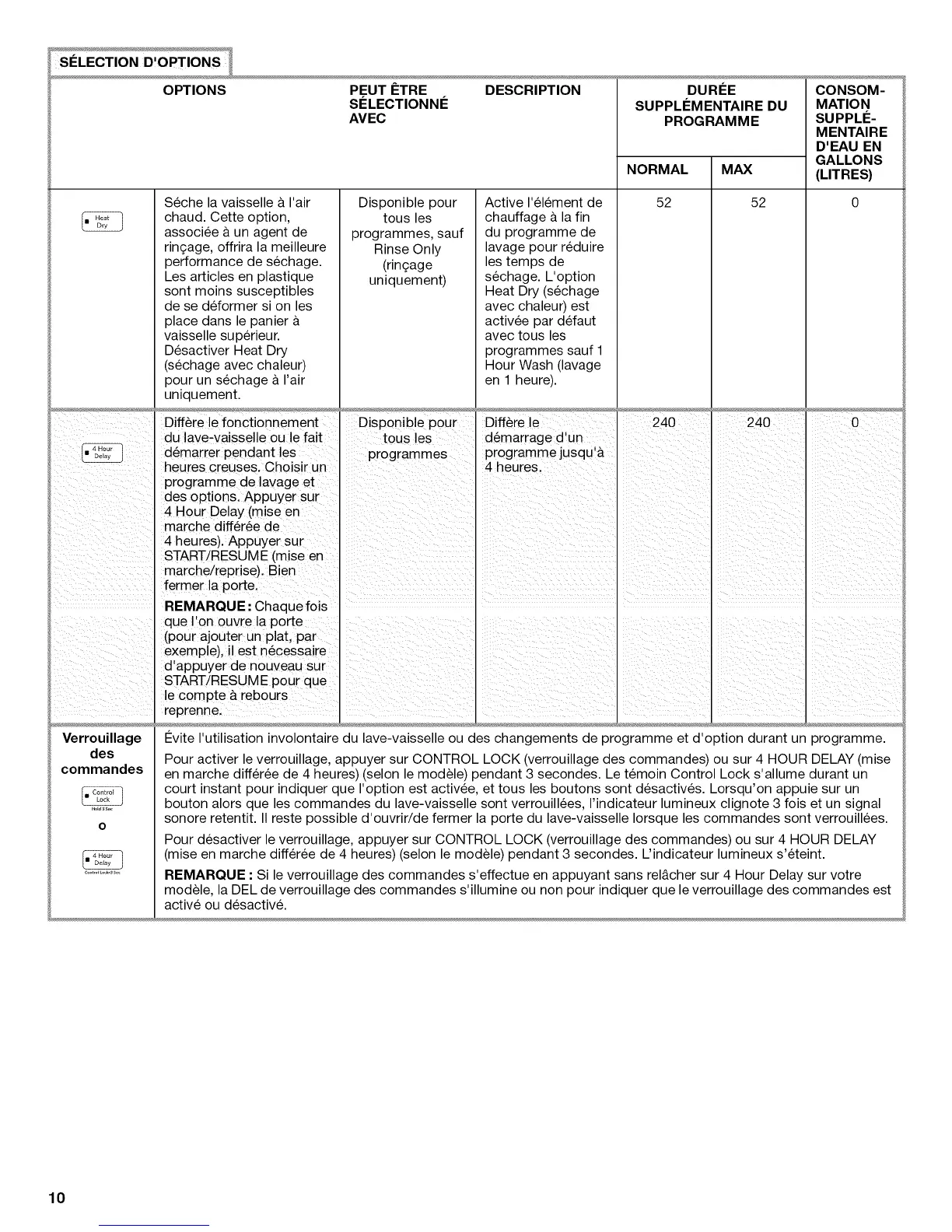 en marche differ6e de 4 heures) (selon le modele) pendant 3 secondes. Le temoin Control Lock s'allume durant un