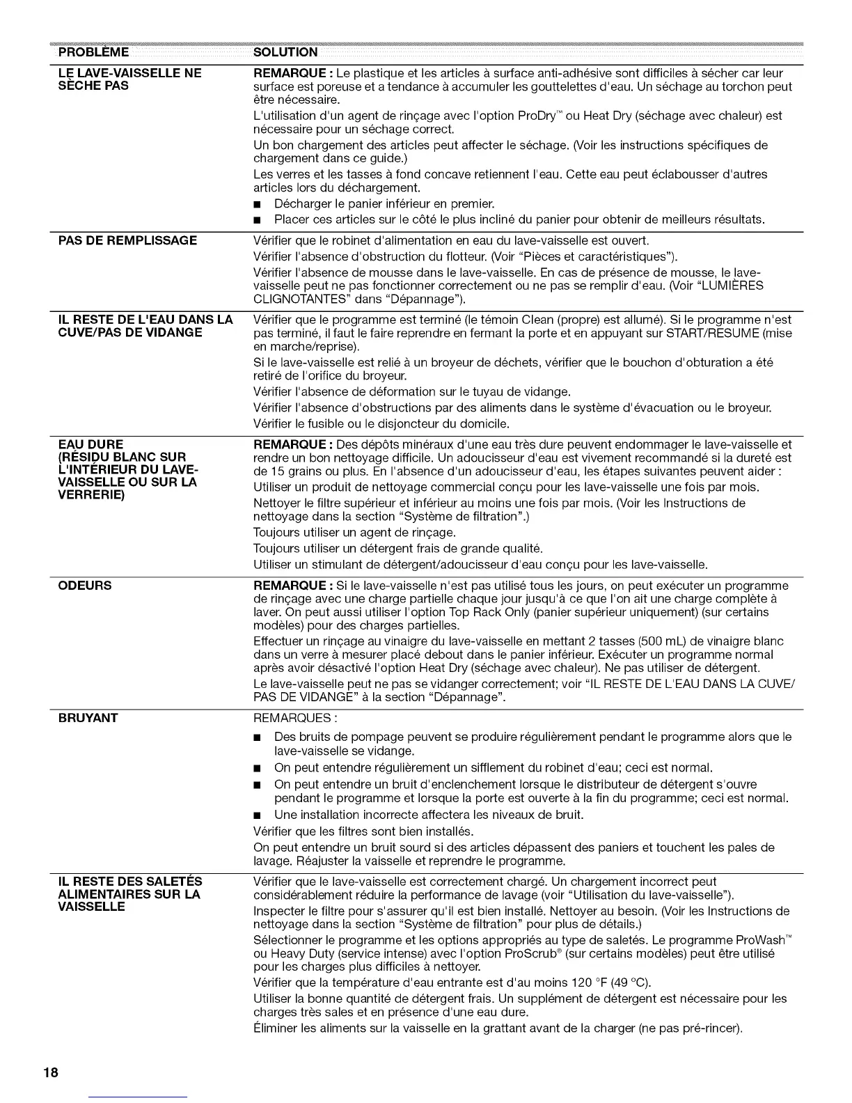 REMARQUE : Des dep6ts mineraux d'une eau tres dure peuvent endommager le lave-vaisselle et