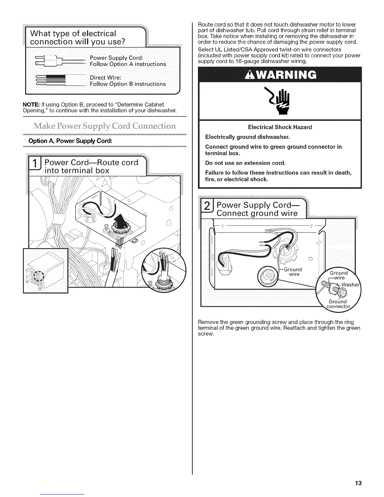 part of dishwasher tub. Pull cord through strain relief in terminal