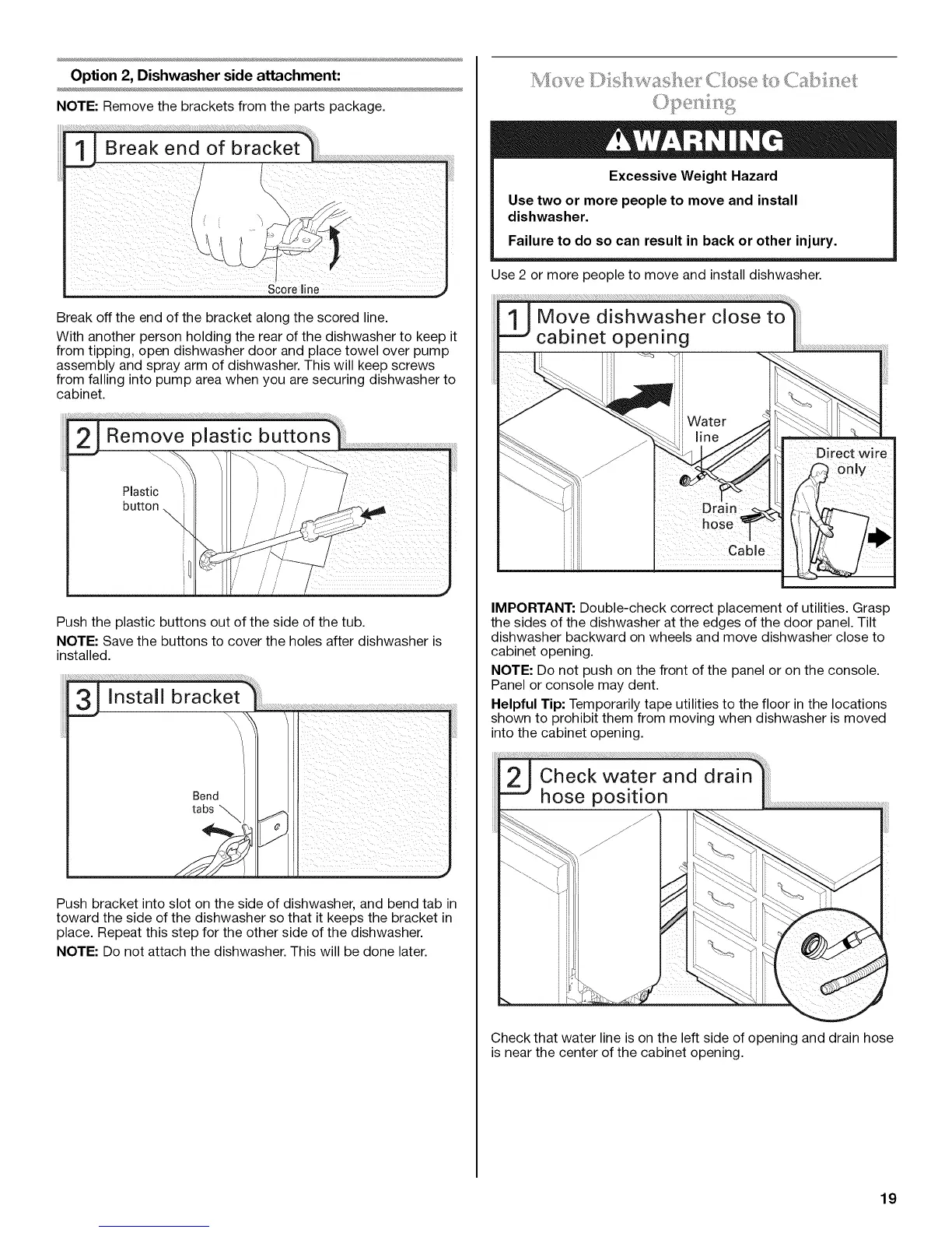 Use 2 or more people to move and install dishwasher.