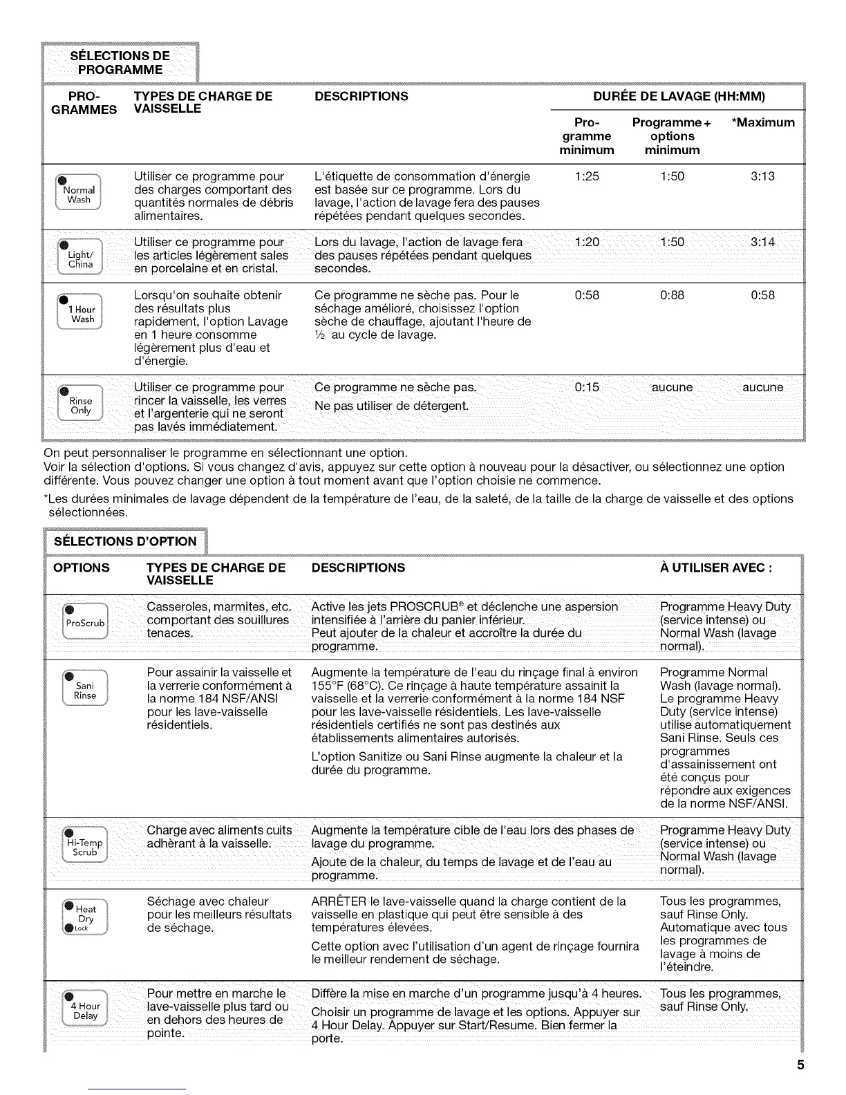 *Les durees minimales de lavage dependent de la temperature de I'eau, de la salete, de la taille de la charge de vaisselle et des options