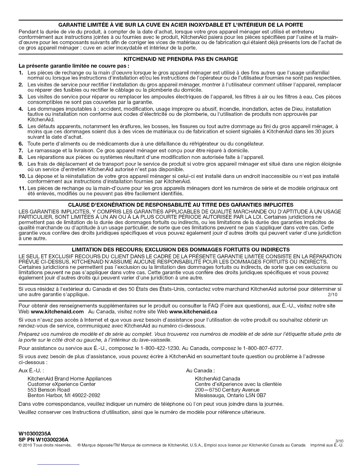© 2010 Tous droits reserves. ® Marque deposee/TM Marque de commerce de KitchenAid, U.S.A., Emploi sous licence par KitchenAid Canada au Canada Imprime aux t_.-U.