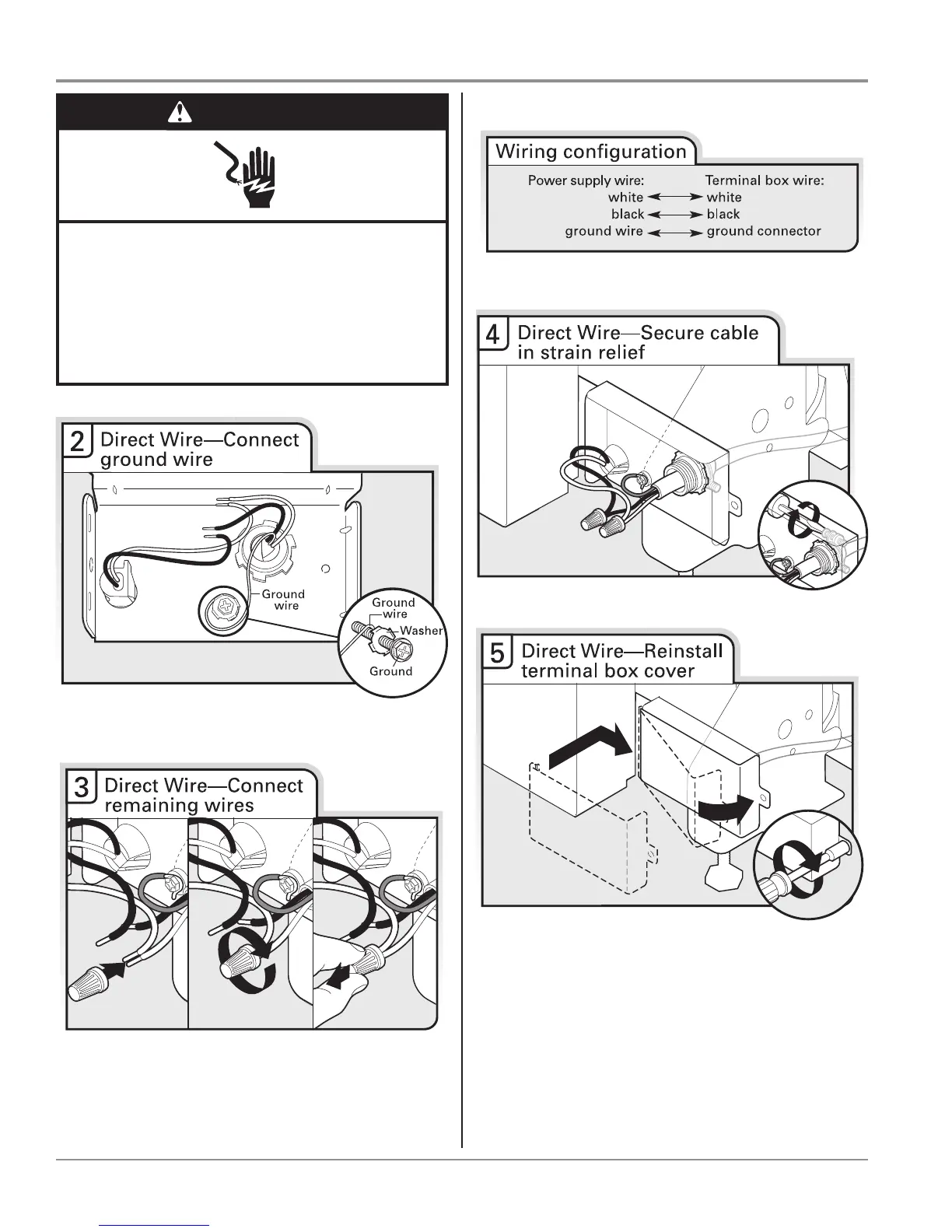 Place wires inside terminal box. Insert tabs on left side of cover.