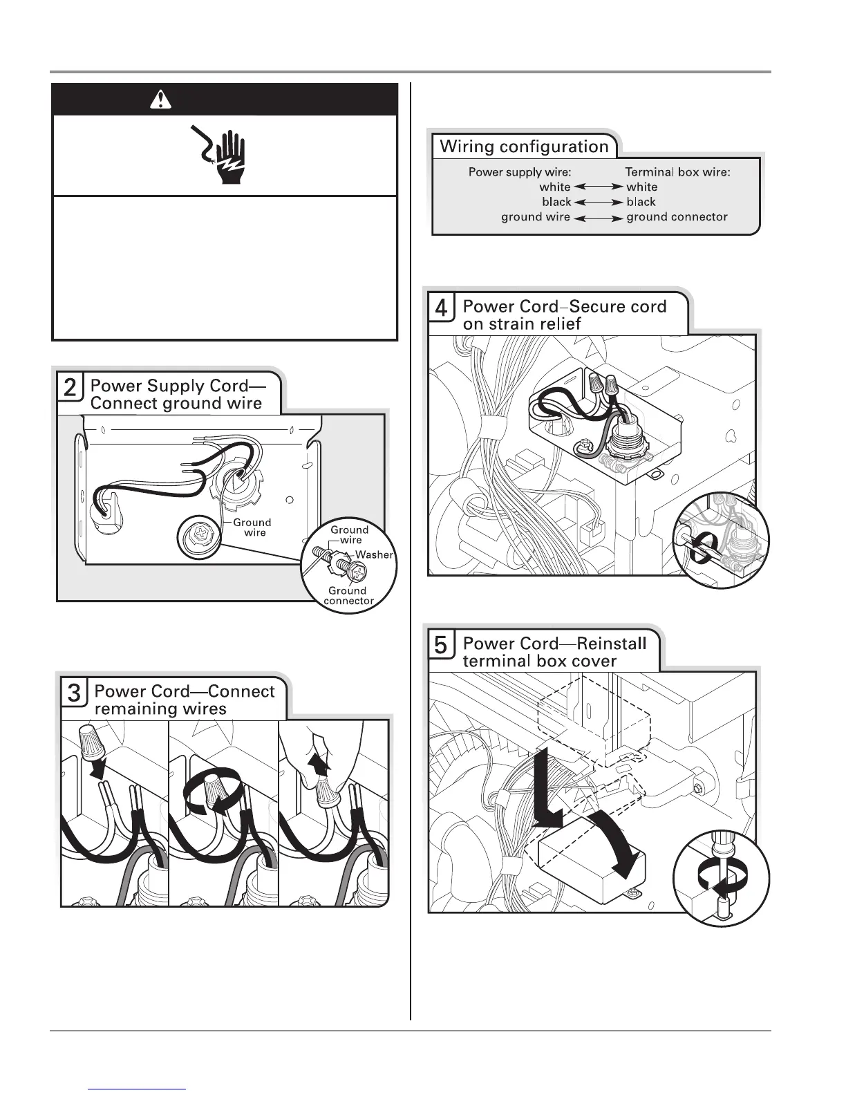 Place wires inside terminal box. Insert tabs on left side of cover.