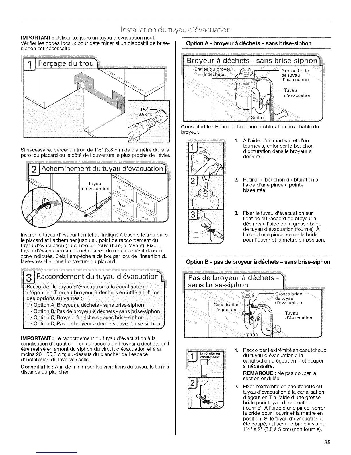 IMPORTANT: Utiliser toujours un tuyau d'evacuation neuf.