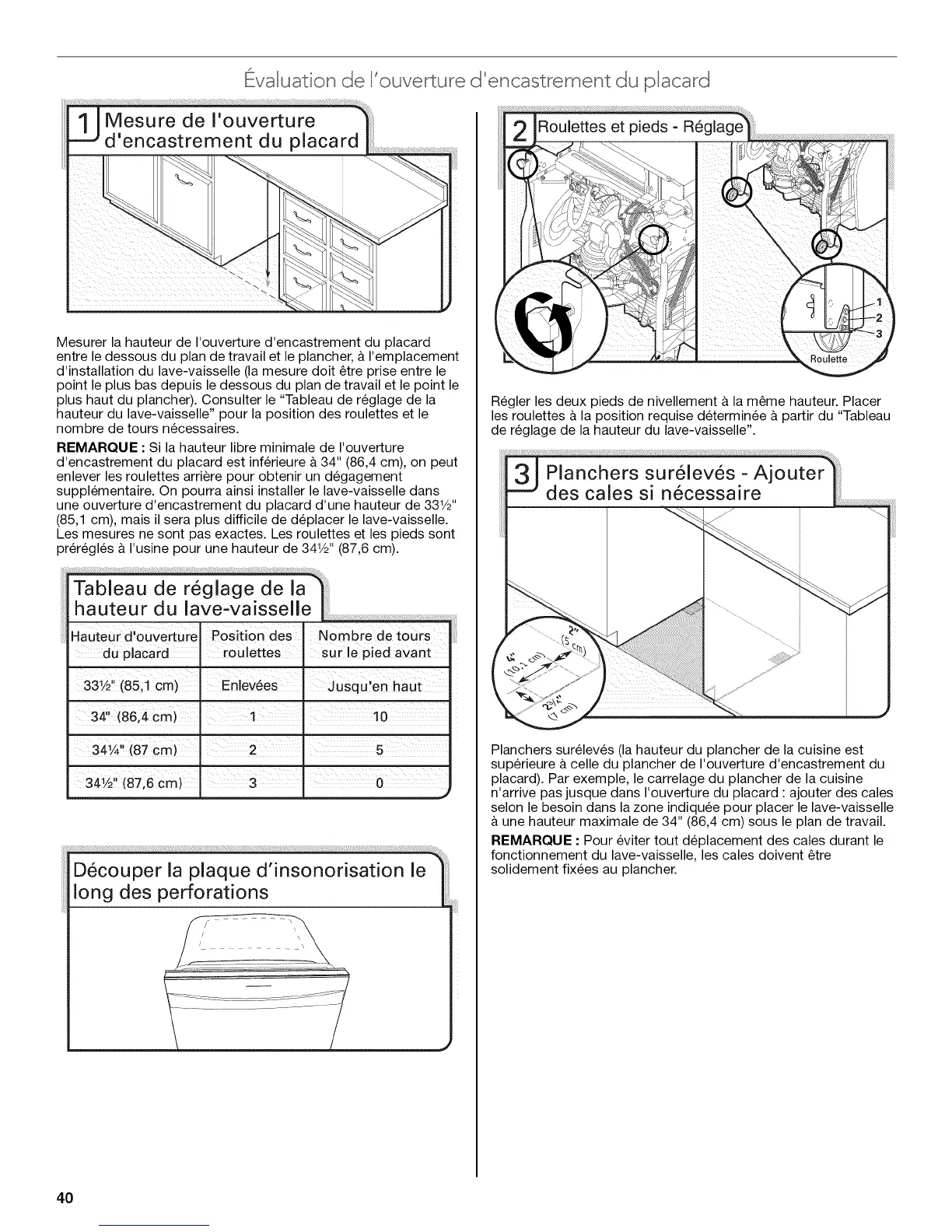hauteur du lave-vaisselle" pour la position des roulettes et le