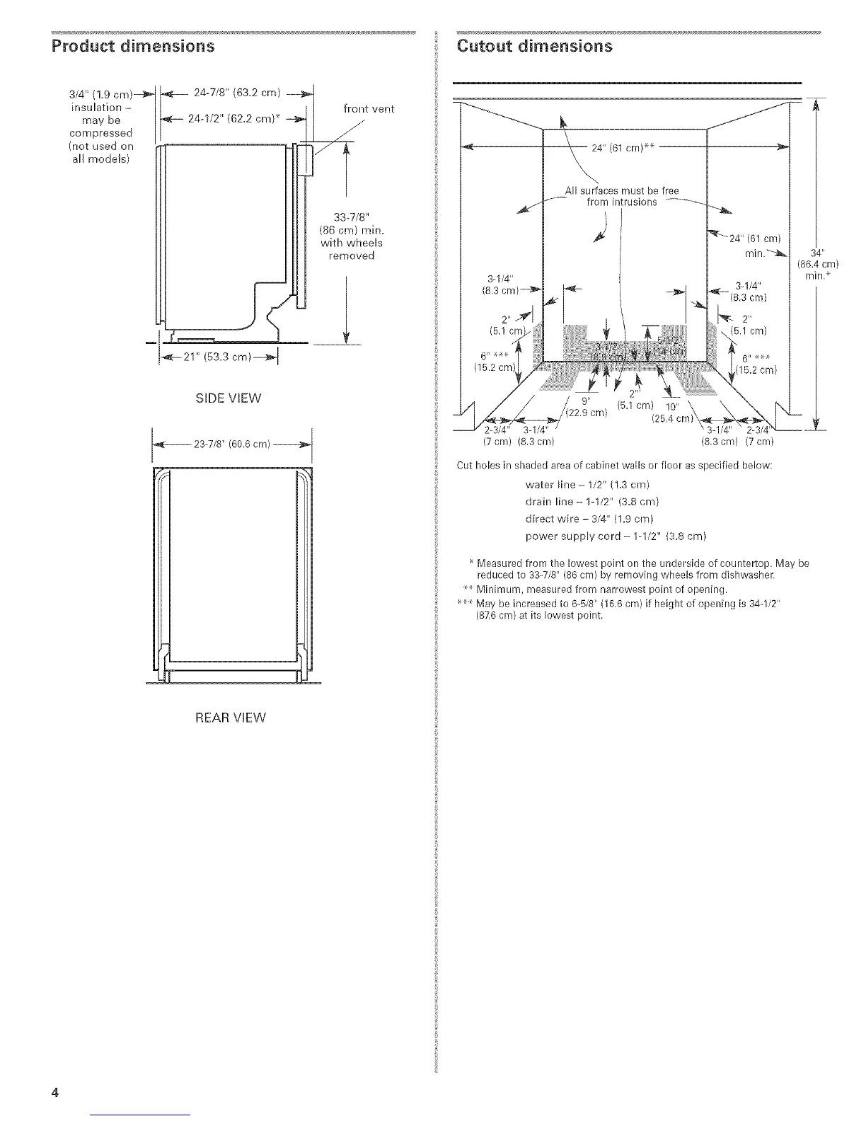 reduced to 33-7/8" (86 cm) by removing wheels from dishwasher.