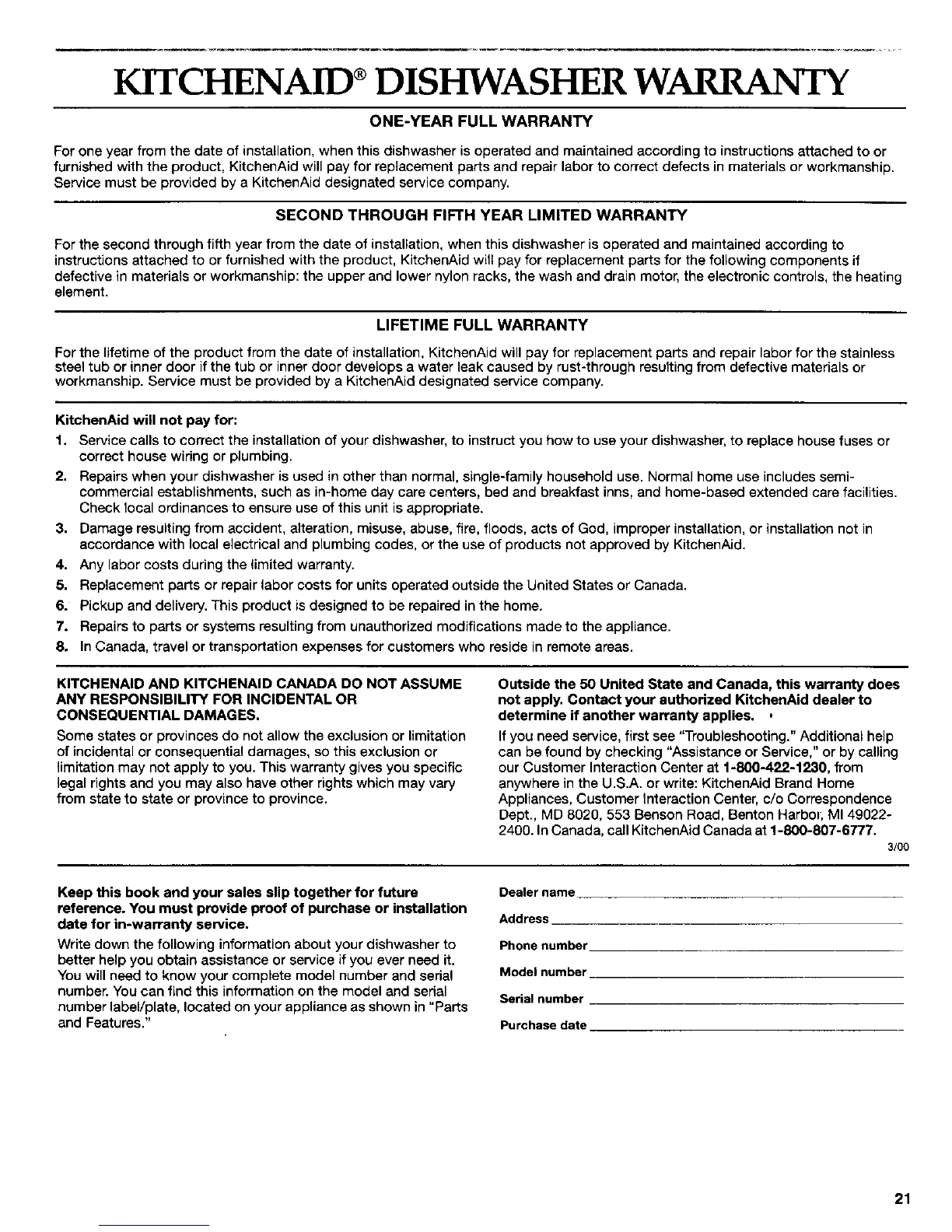 workmanship. Service must be provided by a KitchenAid designated service company.