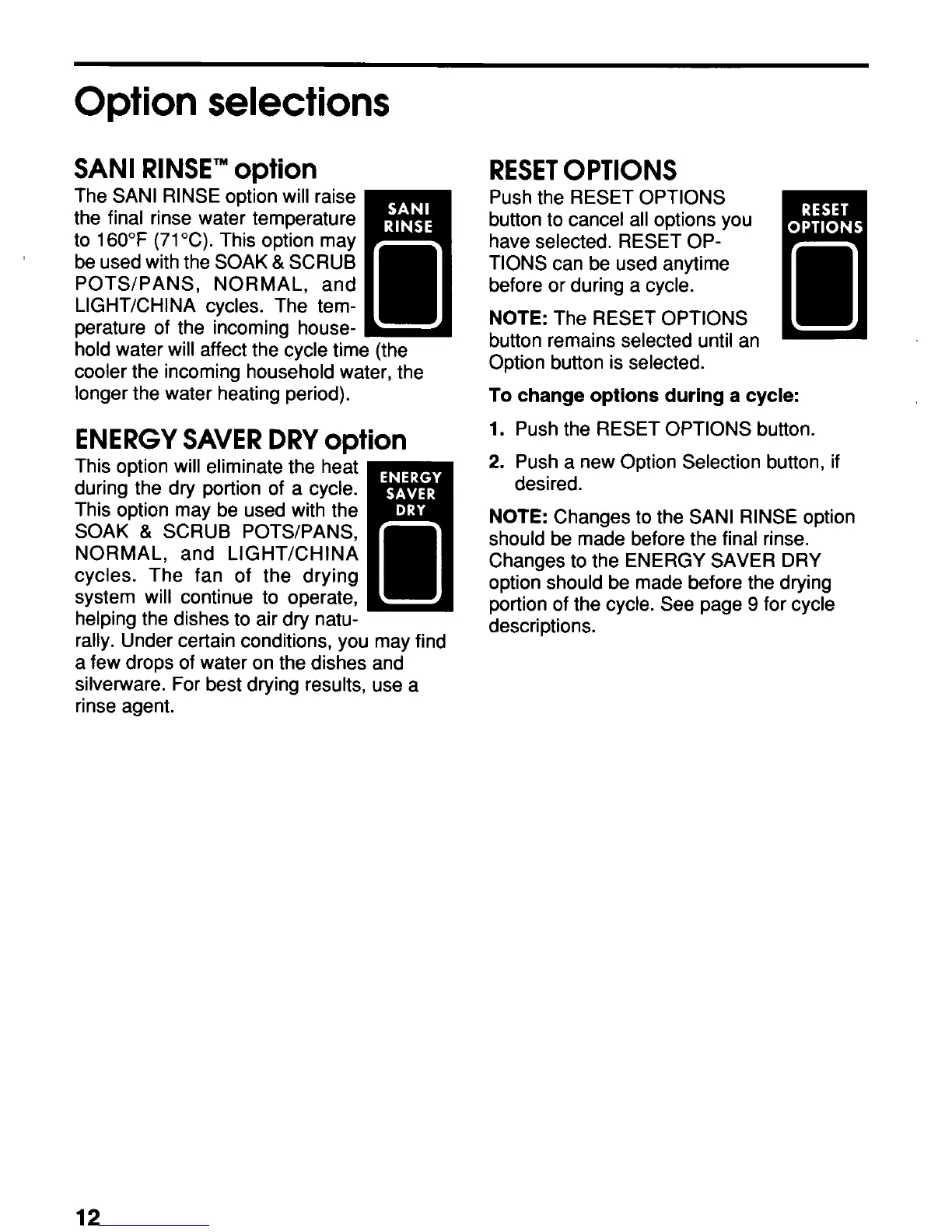 KitchenAid KUDS23HB - Option Selections; Sani Rinse Option; Energy Saver Dry Option; Reset Options