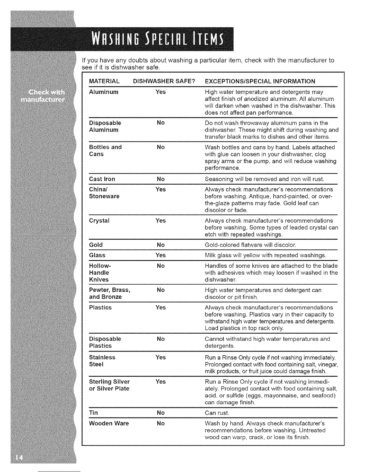 MATERIAL DISHWASHER SAFE? EXCEPTIONS/SPECIAL INFORMATION