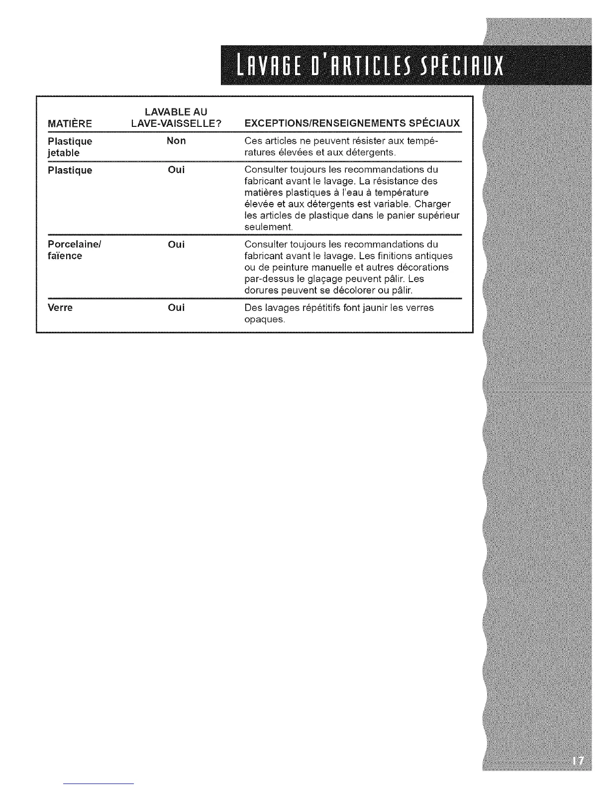 MATI#RE LAVE=VAISSELLE? EXCEPTIONS/RENSEIGNEMENTS SPECIAUX