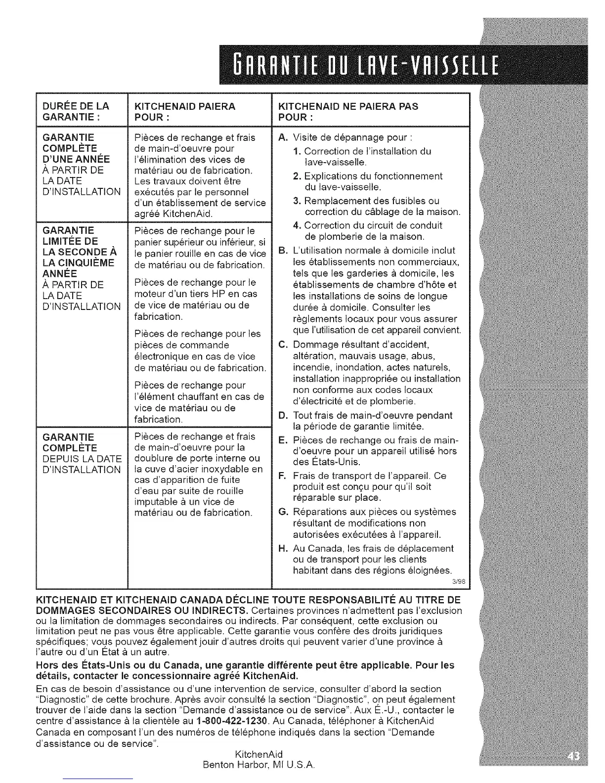 KITCHENAID ET KITCHENAID CANADA D#CLINE TOUTE RESPONSABILITĀ¢: AU TITRE DE