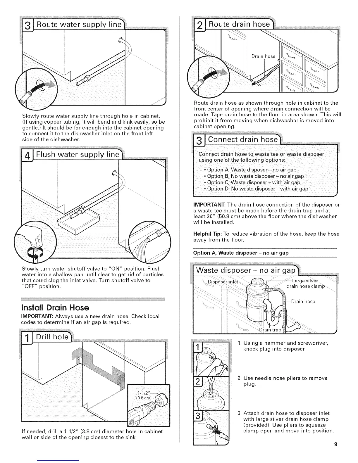 Route drain hose as shown through hole in cabinet to the