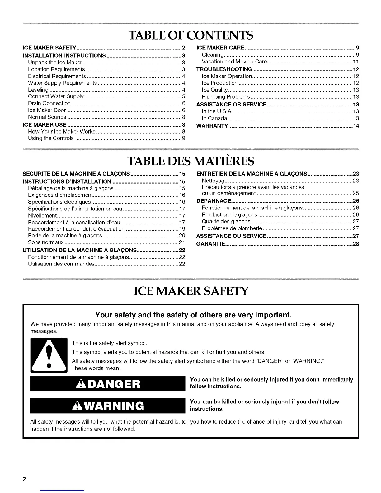 ICE MAKER SAFETY ...................................................................... 2