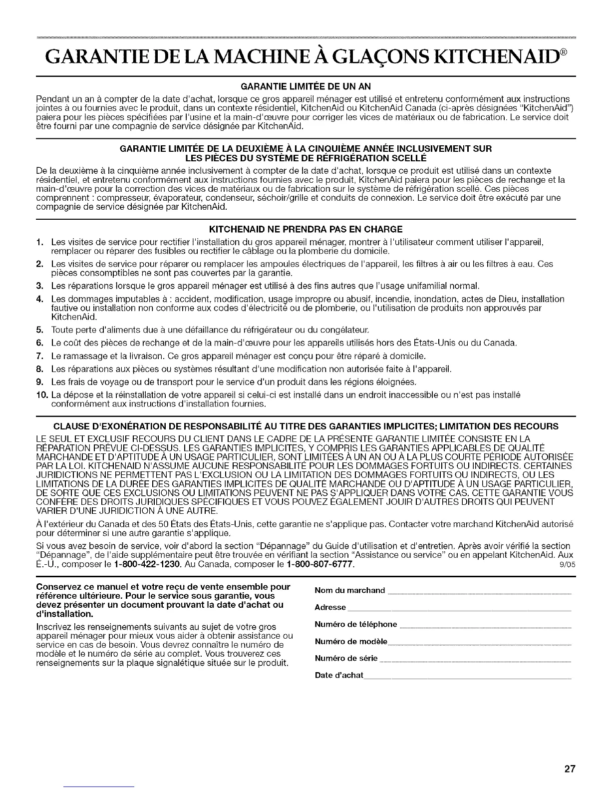 PAR LA LOI. KITCHENAID N'ASSUME AUCUNE RESPONSABILITE POUR LES DOMMAGES FORTUITS OU INDIRECTS. CERTAINES
