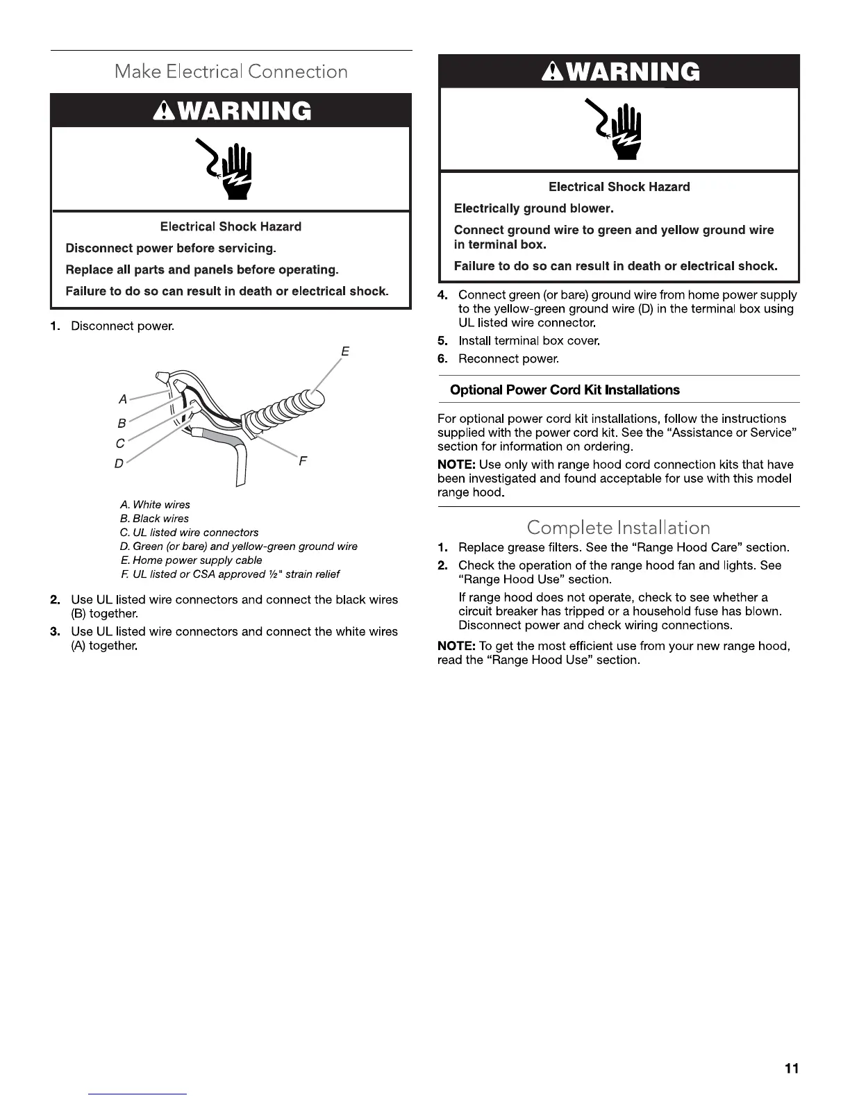 KitchenAid KVUB600DSS - Make Electrical Connection; Complete Installation; Optional Power Cord Kit Installations