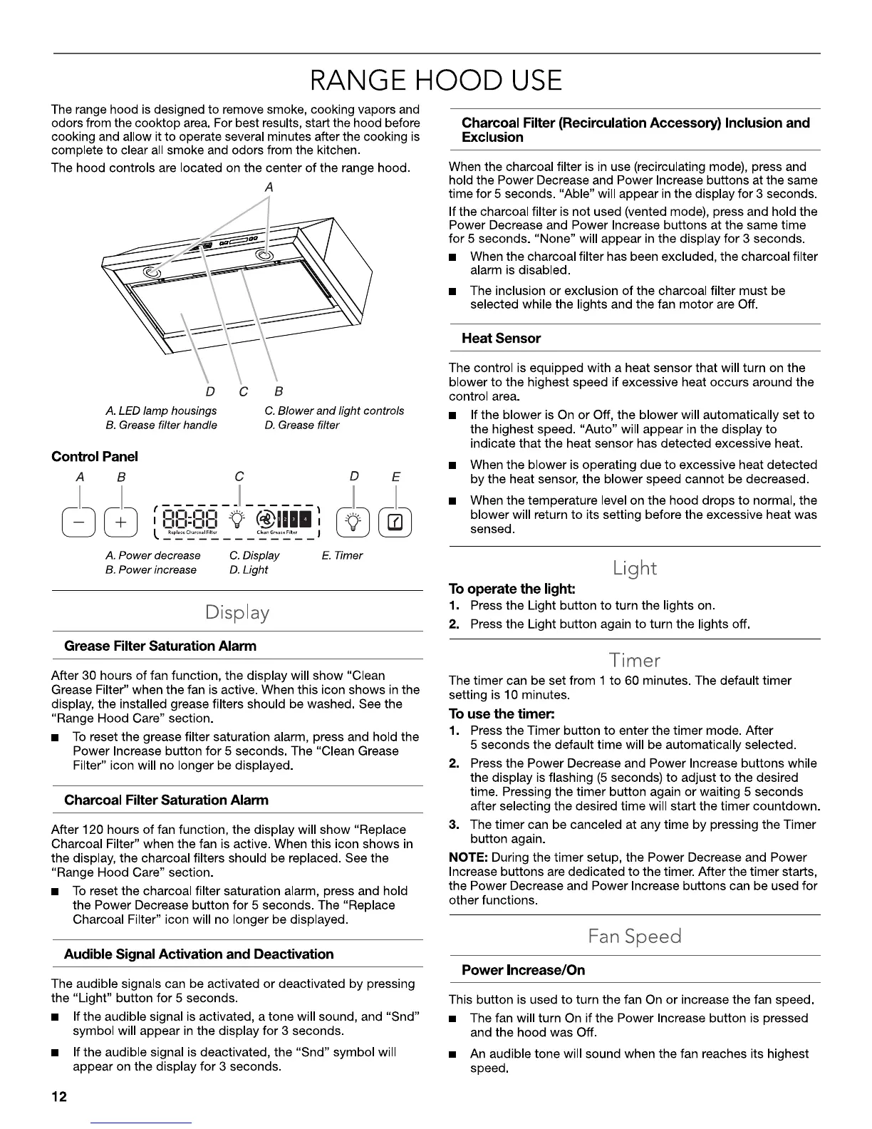 KitchenAid KVUB600DSS - Range Hood Use; Display; Timer; Fan Speed