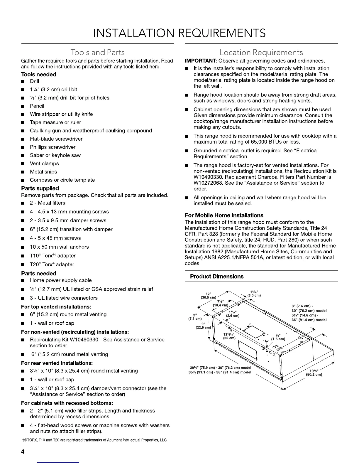 KitchenAid KVUB600DSS - Installation Requirements; Tools and Parts; Location Requirements; Product Dimensions