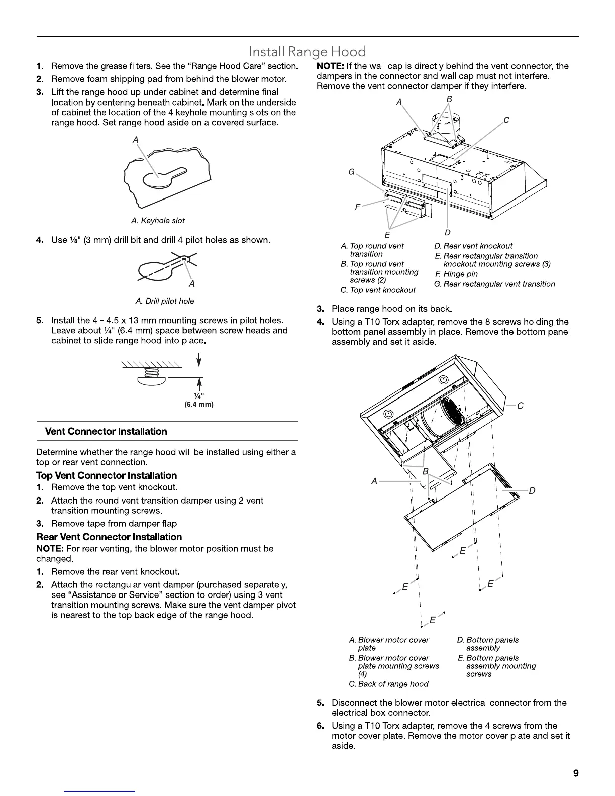 KitchenAid KVUB600DSS - Install Range Hood; Vent Connector Installation; Top;Rear Vent Connector Installation; Keyhole Slot