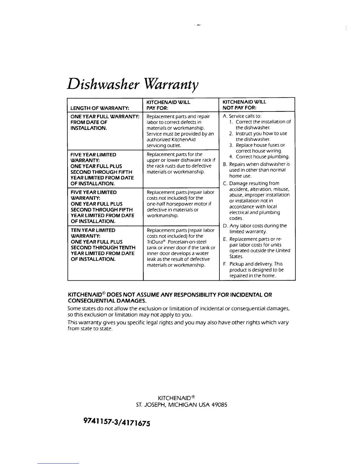 KitchenAid Superba KUDS220T - Dishwasher Warranty