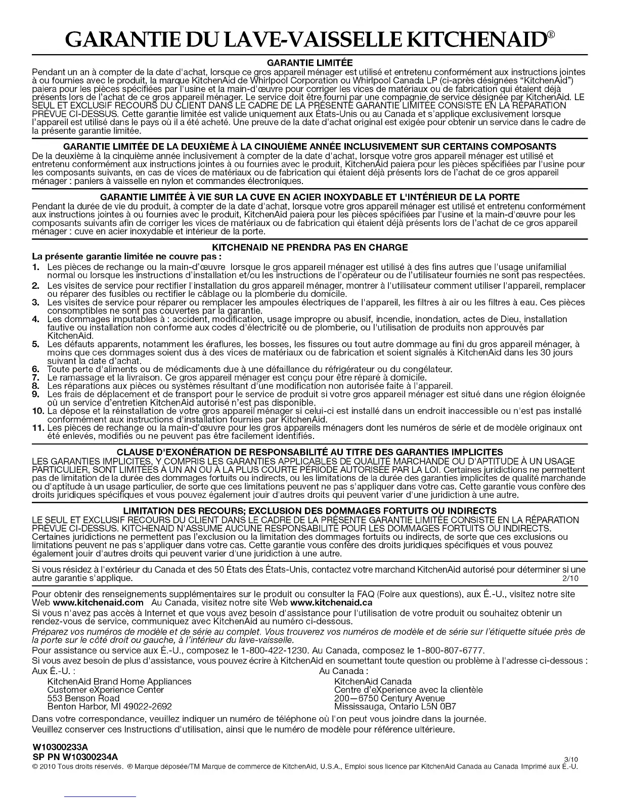 © 2010 Tous droits reserves. ® Marque deposee/TM Marque de commerce de KitchenAid, U.S.A., Emploi sous licence par KitchenAid Canada au Canada Imprime aux t_.-U.