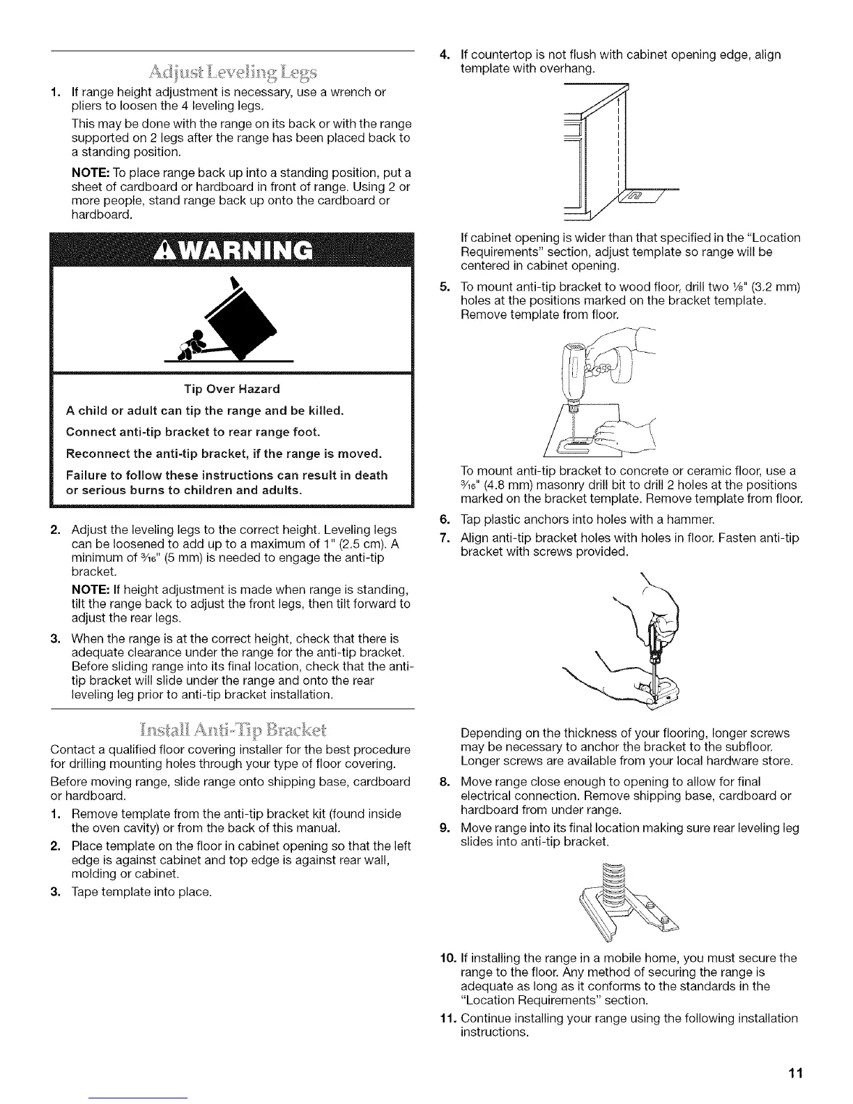 To mount anti-tip bracket to wood floor, drill two %" (3.2 mm)