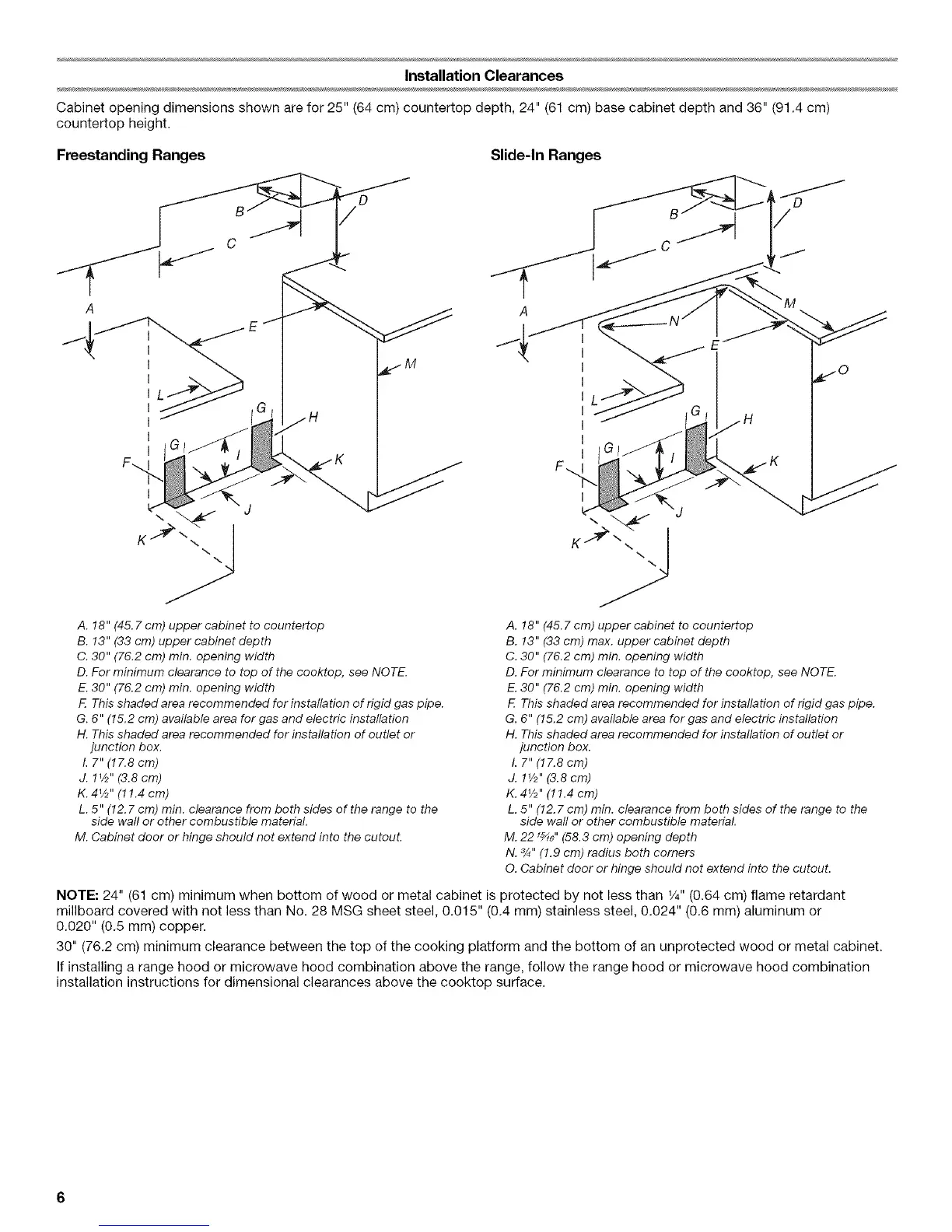 NOTE: 24" (61 cm) minimum when bottom of wood or metal cabinet is protected by not less than 1/4"(0.64 cm) flame retardant