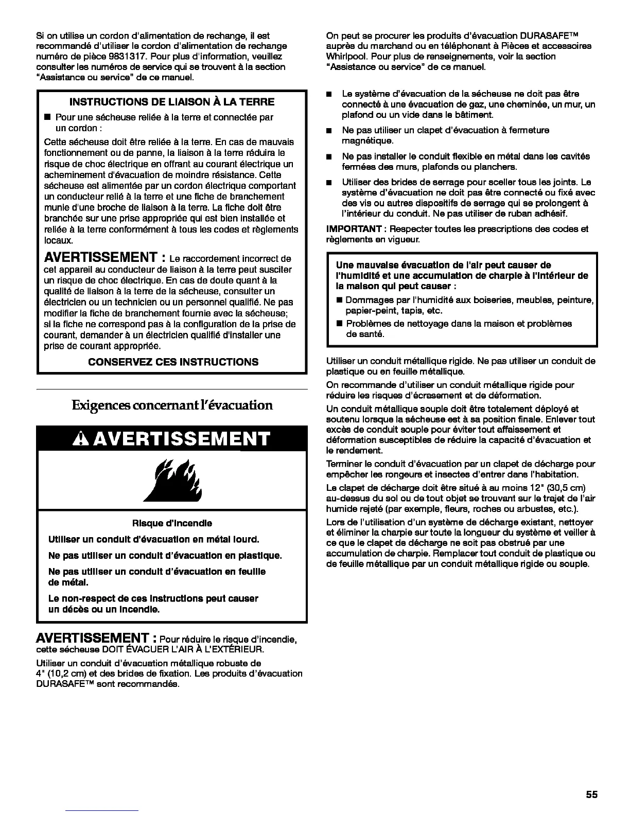 Ne pas utlllser un condult d'6vacuatlon en plastlque.