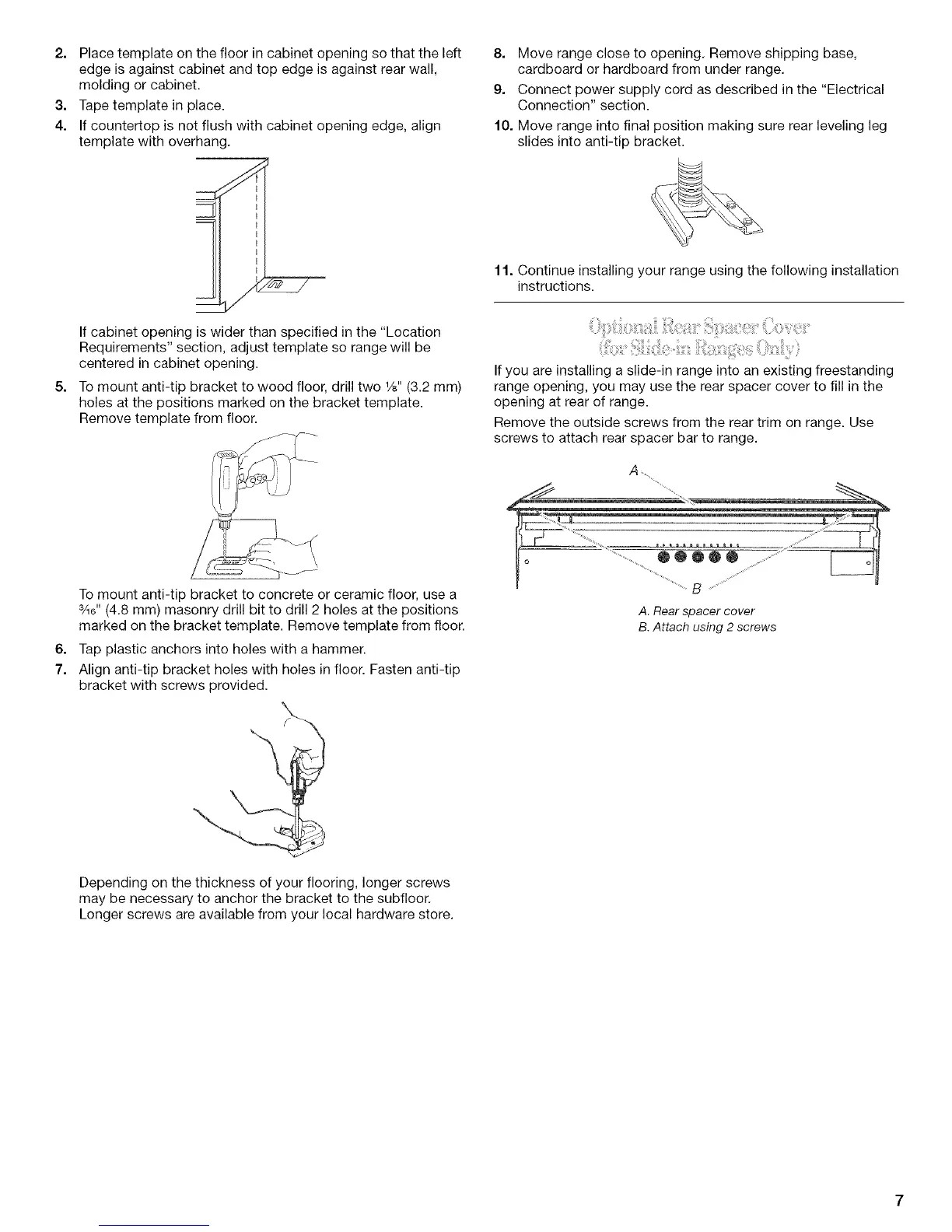 7. Align anti-tip bracket holes with holes in floor. Fasten anti-tip