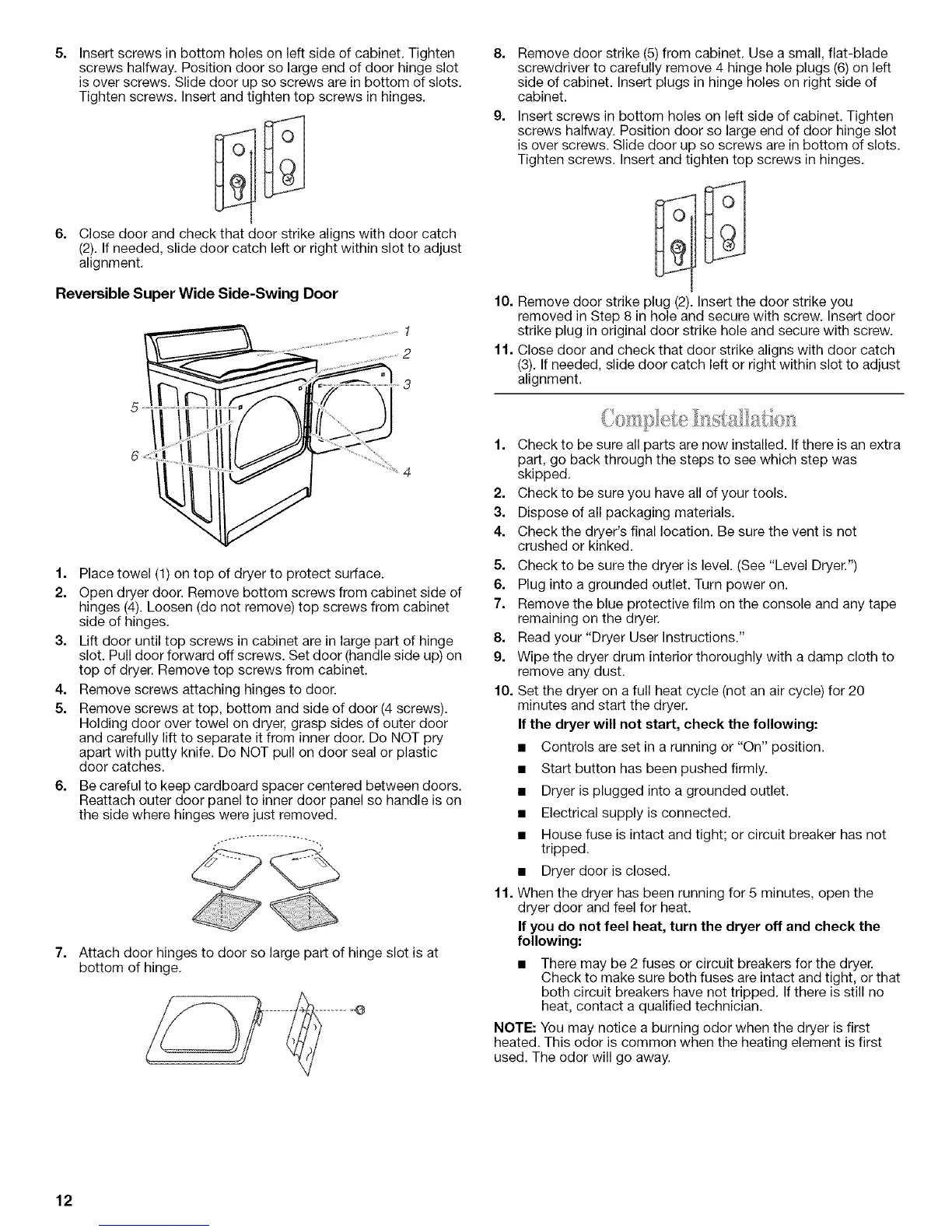 2. Open dryer door. Remove bottom screws from cabinet side of