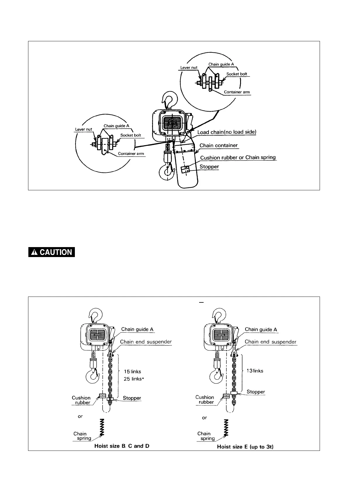 When a chain container is used, the stopper is attached to the 3rd link from the free end of the load chain.