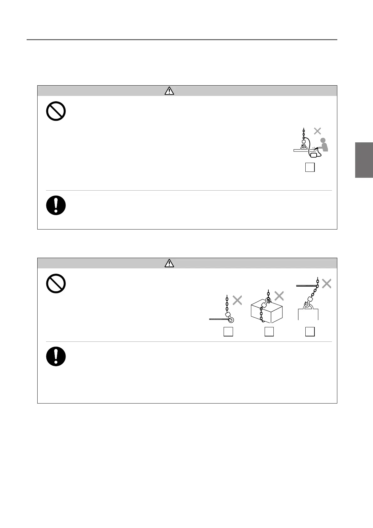 • Carry out the slinging with equal load on slinging devices for stable lifting of a load.