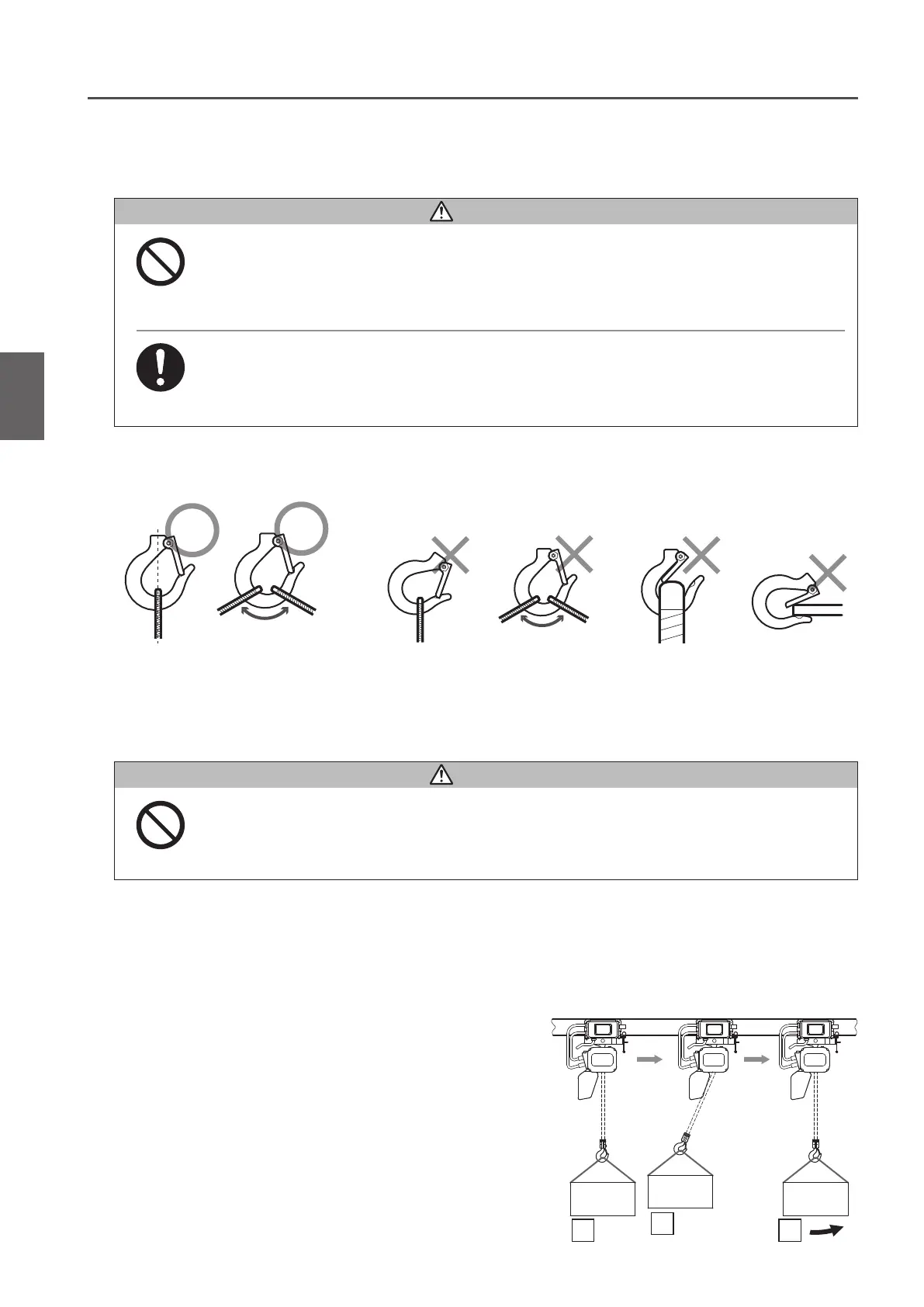 • Do not move the electric chain hoist with a load hung at one side of the Crane Saddle.