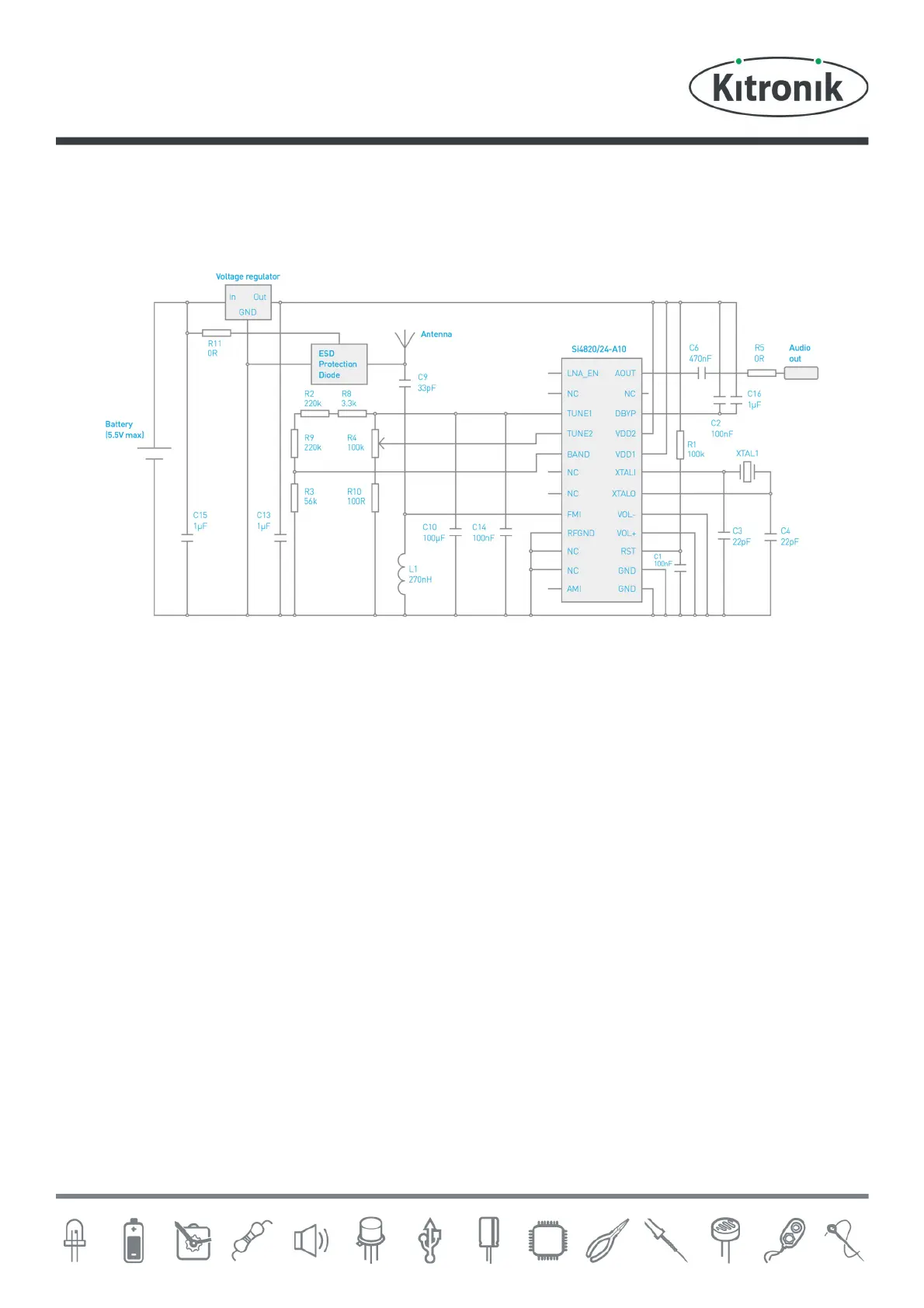 low by R1. C6 takes any DC bias out of the output signal from the radio IC and R5 and R11 just acts as a wire links to