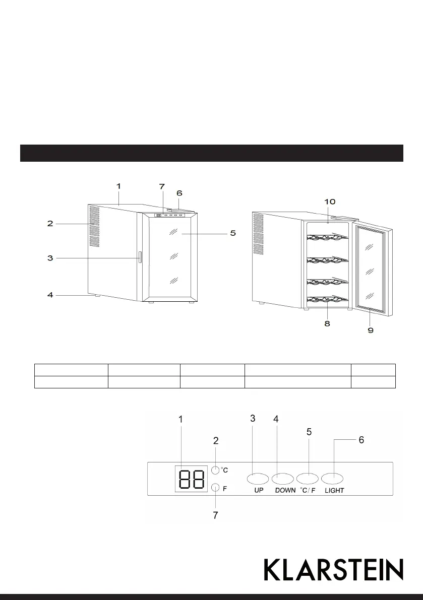 2 Grilles d’aération 4 Pieds 6 Revêtement 8 Clayettes à vin 10 Lampe