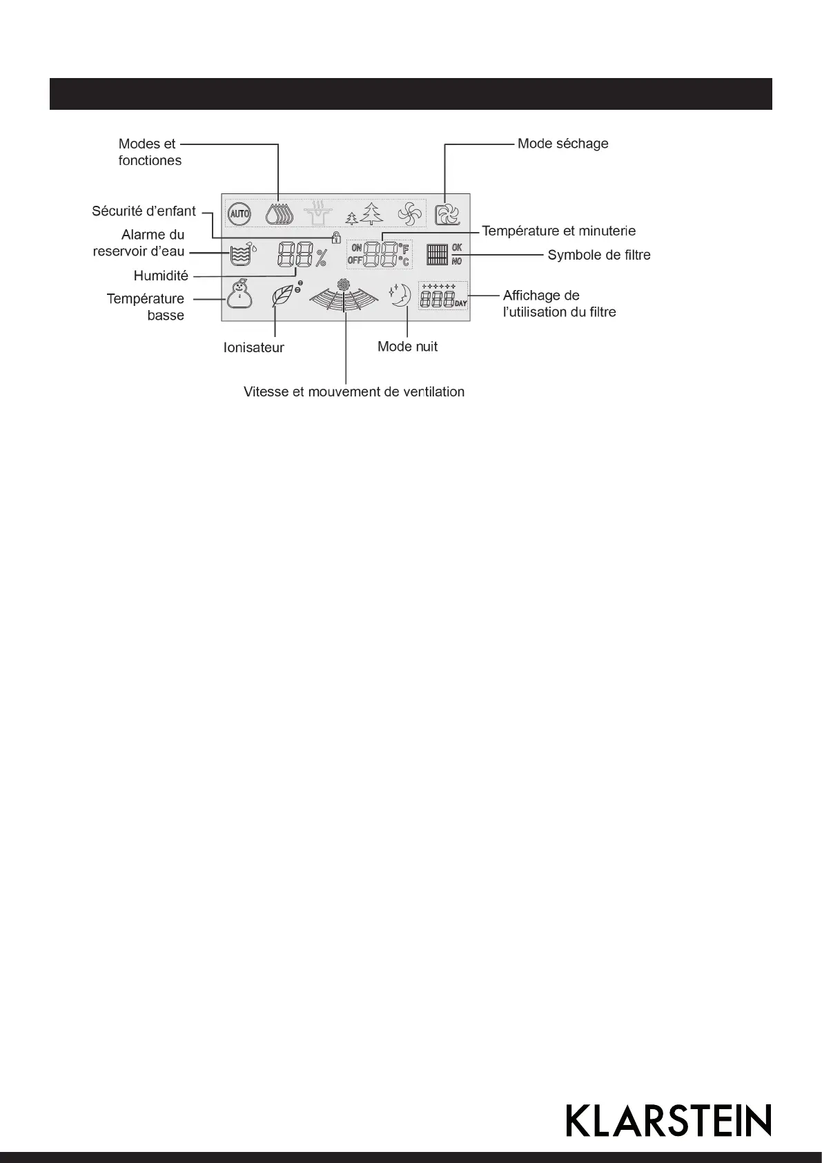 Déshumidi cateur automatique, déshumidi cateur fort, déshumidi cation faible, ionisateur, ventila-