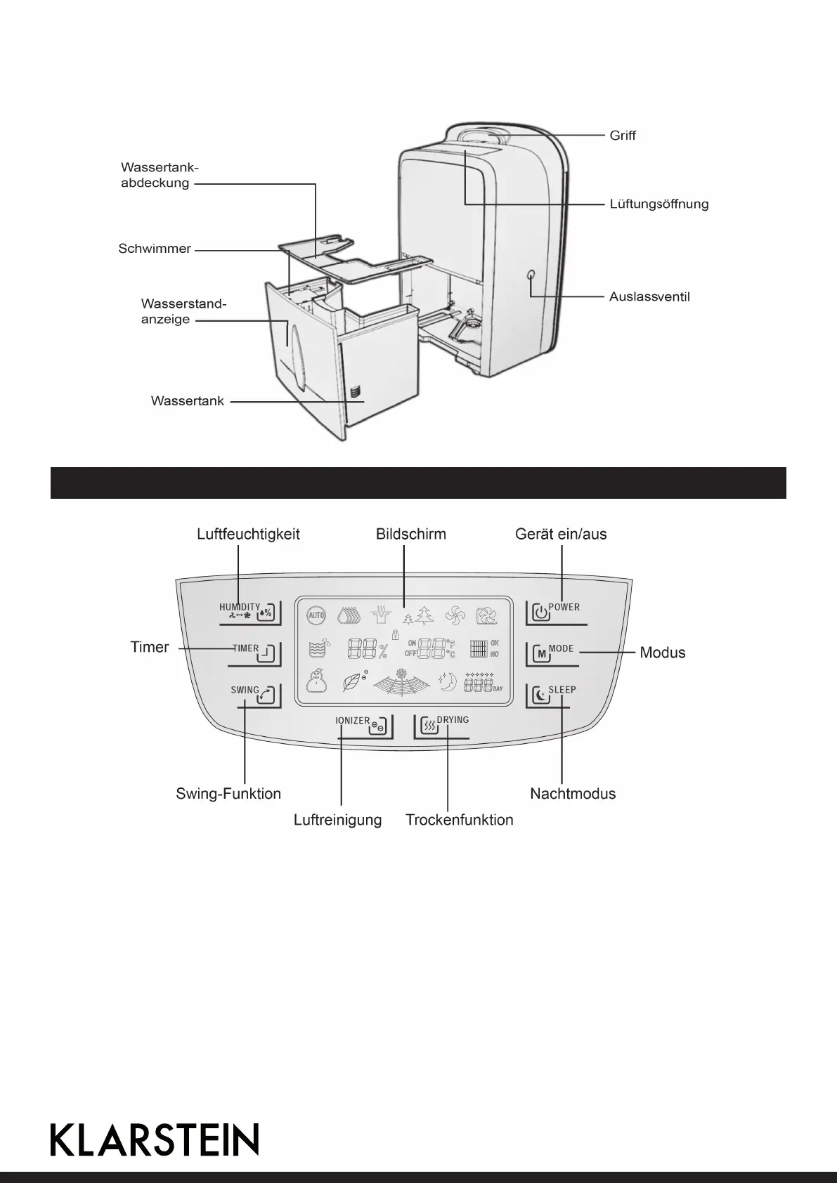 MODE Wählen Sie zwischen Auto/starker/leichter Entfeuchtung, Luftreinigung und Ventilator.