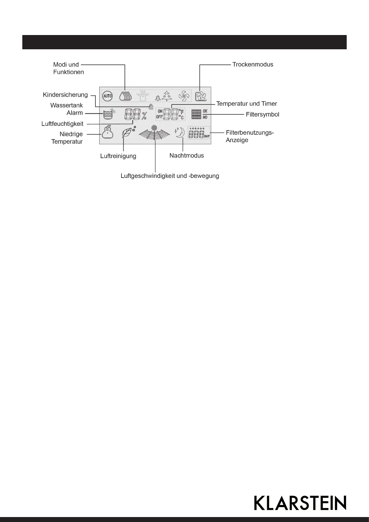 Auto-Entfeuchtung, starke Entfeuchtung, leichte Entfeuchtung, Luftreinigung, Ventilator.