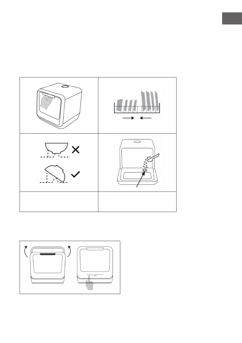 Remove the larger food residues from the dishes. Open the door, place the dishes in the